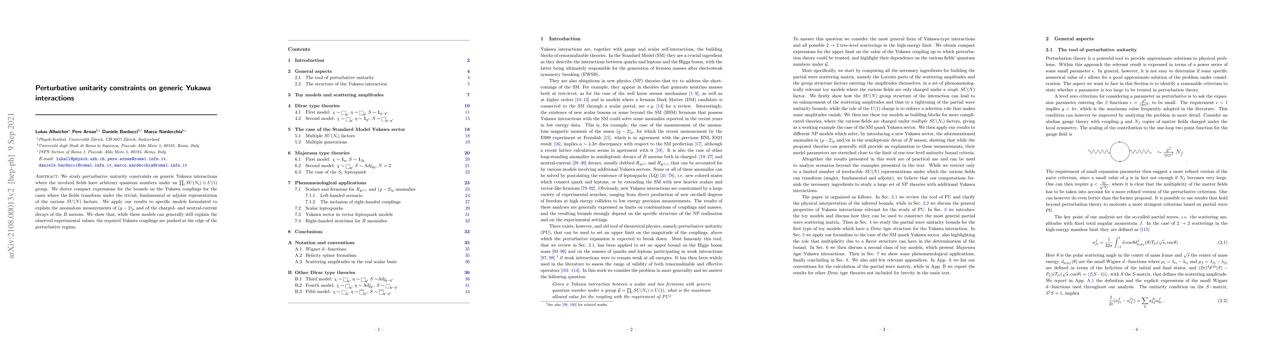 We study perturbative unitarity constraints on generic Yukawa interactions where the involved fields have arbitrary quantum numbers under an $\prod_i SU(N_i) \otimes U(1)$ group. We derive compact expressions for the bounds on the Yukawa couplings for the cases where the fields transform under the trivial, fundamental or adjoint representation of the various $SU(N)$ factors. We apply our results to specific models formulated to explain the anomalous measurements of $(g-2)_\mu$ and of the charged- and neutral-current decays of the $B$ mesons. We show that, while these models can generally still explain the observed experimental values, the required Yukawa couplings are pushed at the edge of the perturbative regime.
