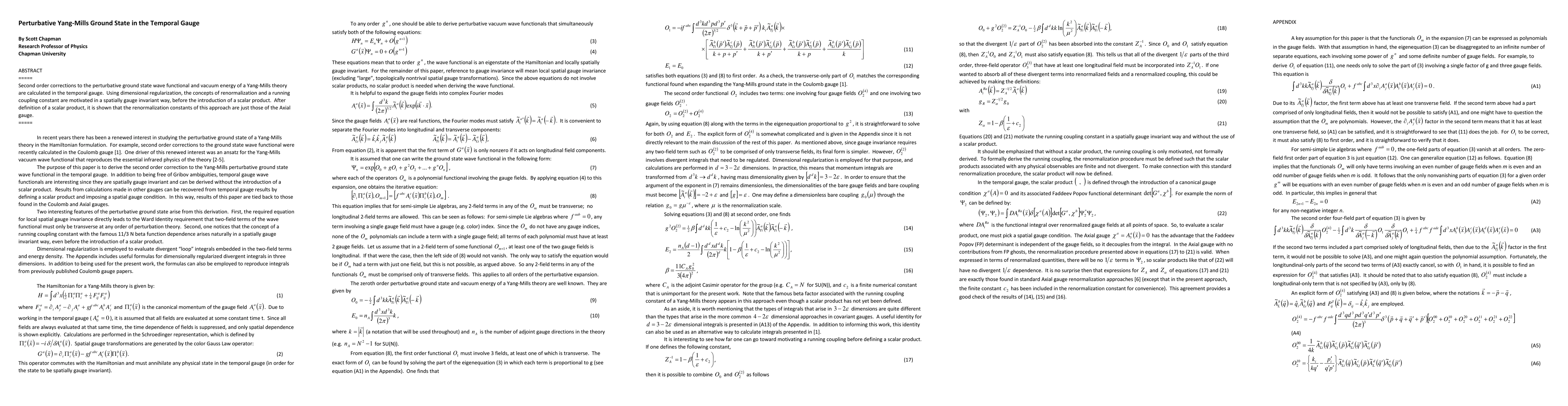 This paper calculates second-order corrections to the perturbative ground state wave functional and vacuum energy in a Yang-Mills theory using the temporal gauge. It introduces renormalization and a running coupling constant in a spatially gauge invariant manner, and shows that the renormalization constants align with those of the Axial gauge after defining a scalar product.