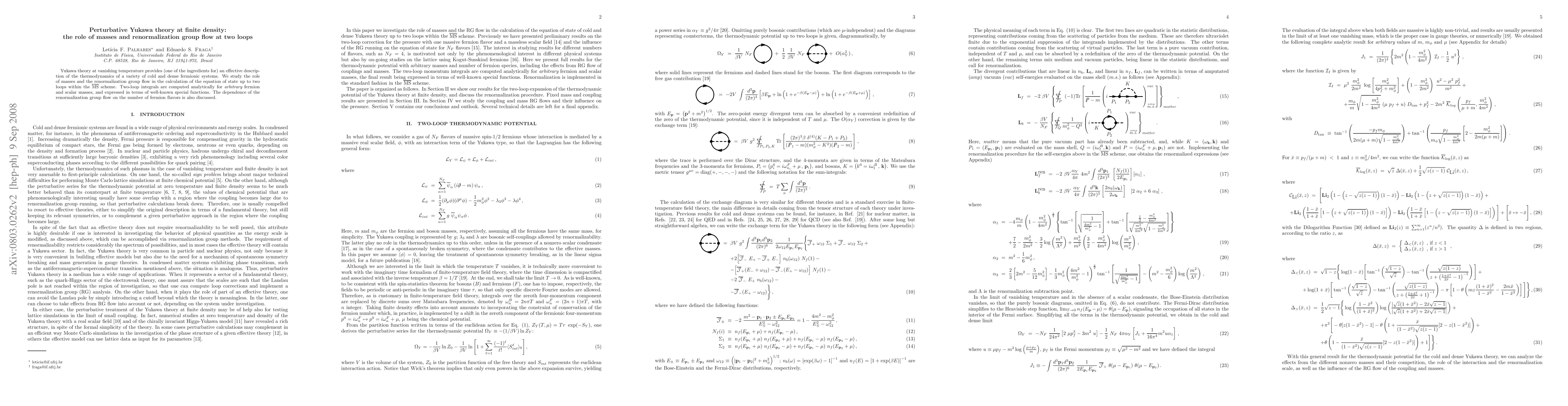 Yukawa theory at vanishing temperature provides (one of the ingredients for) an effective description of the thermodynamics of a variety of cold and dense fermionic systems. We study the role of masses and the renormalization group flow in the calculation of the equation of state up to two loops within the MSbar scheme. Two-loop integrals are computed analytically for arbitrary fermion and scalar masses, and expressed in terms of well-known special functions. The dependence of the renormalization group flow on the number of fermion flavors is also discussed.