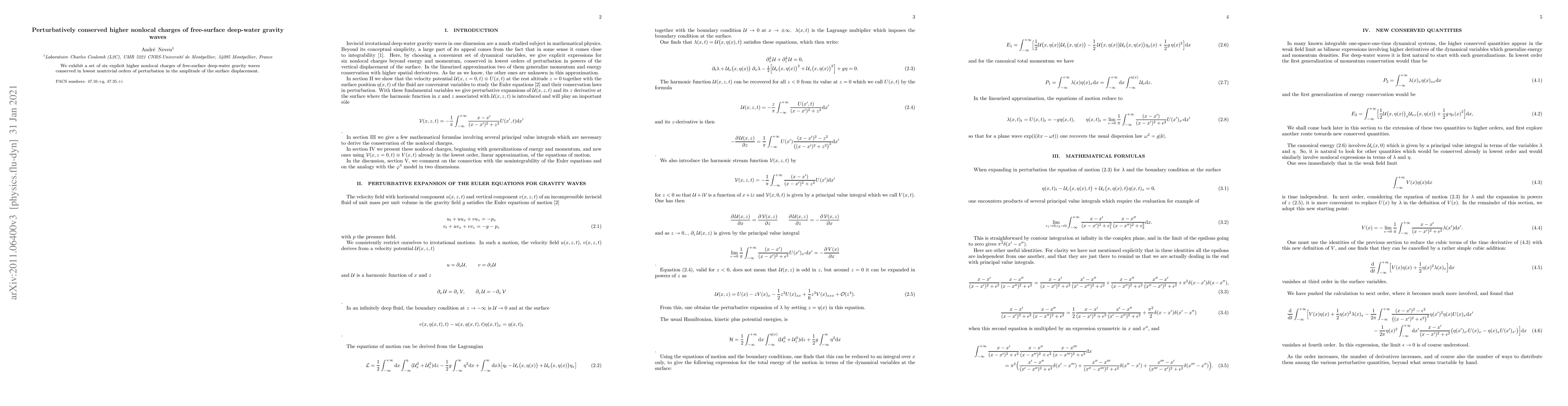 Summary: This paper identifies six higher nonlocal charges conserved in the lowest perturbation orders of free-surface deep-water gravity waves, providing new insights into the dynamics of these waves. The findings reveal conserved quantities that are significant in understanding wave behavior.