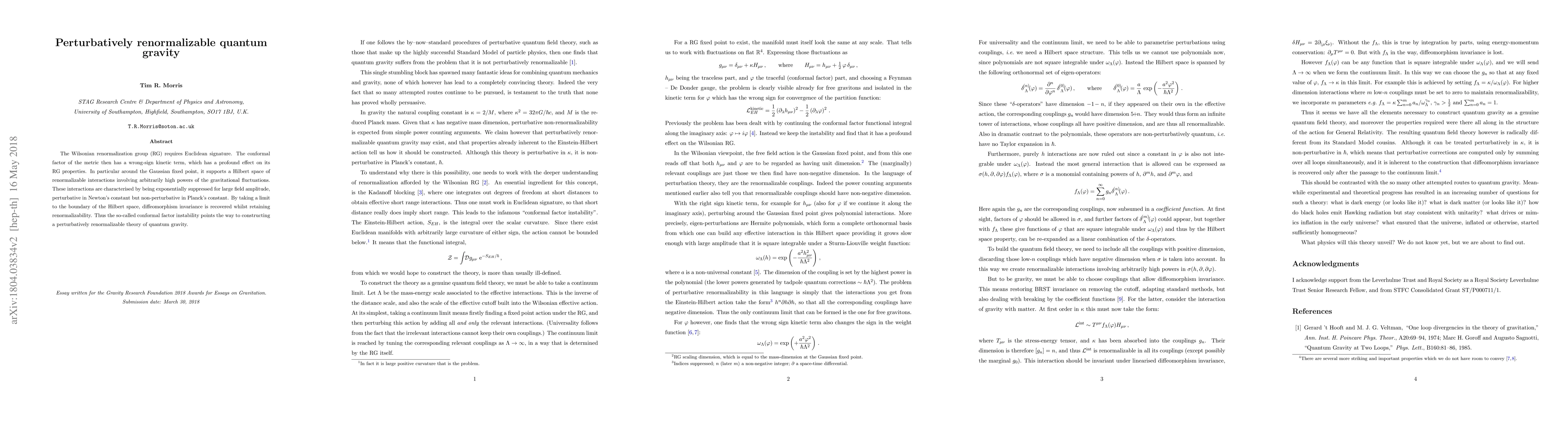 This paper explores how the conformal factor of the metric in the Wilsonian renormalization group framework leads to a Hilbert space of renormalizable gravitational interactions, which are perturbatively controlled by Newton's constant but non-perturbatively by Planck's constant. By approaching the boundary of this Hilbert space, the authors recover diffeomorphism invariance while maintaining renormalizability, suggesting a pathway to perturbatively renormalizable quantum gravity.