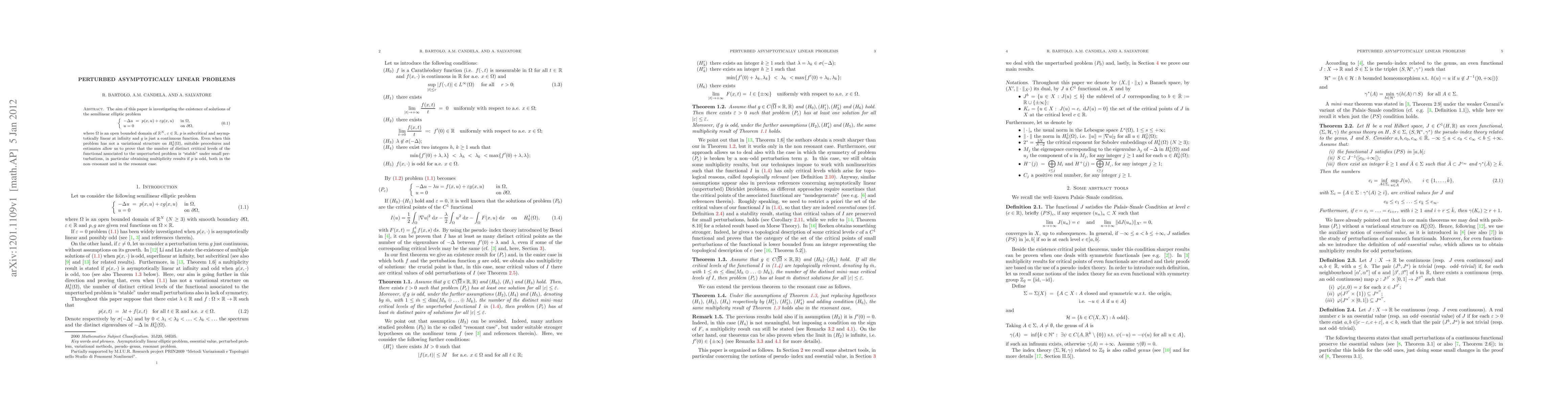 This paper investigates solutions to semilinear elliptic problems with a subcritical nonlinearity that is asymptotically linear at infinity, considering small perturbations. It proves multiplicity results under certain conditions, especially for odd nonlinearities in both non-resonant and resonant cases.