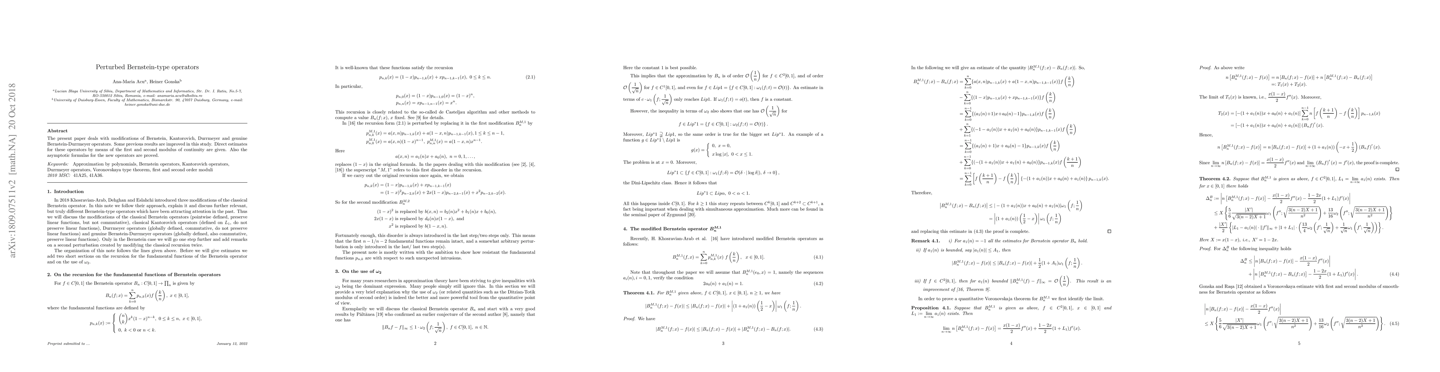 The present paper deals with modifications of Bernstein, Kantorovich, Durrmeyer and genuine Bernstein-Durrmeyer operators. Some previous results are improved in this study. Direct estimates for these operators by means of the first and second modulus of continuity are given. Also the asymptotic formulas for the new operators are proved.