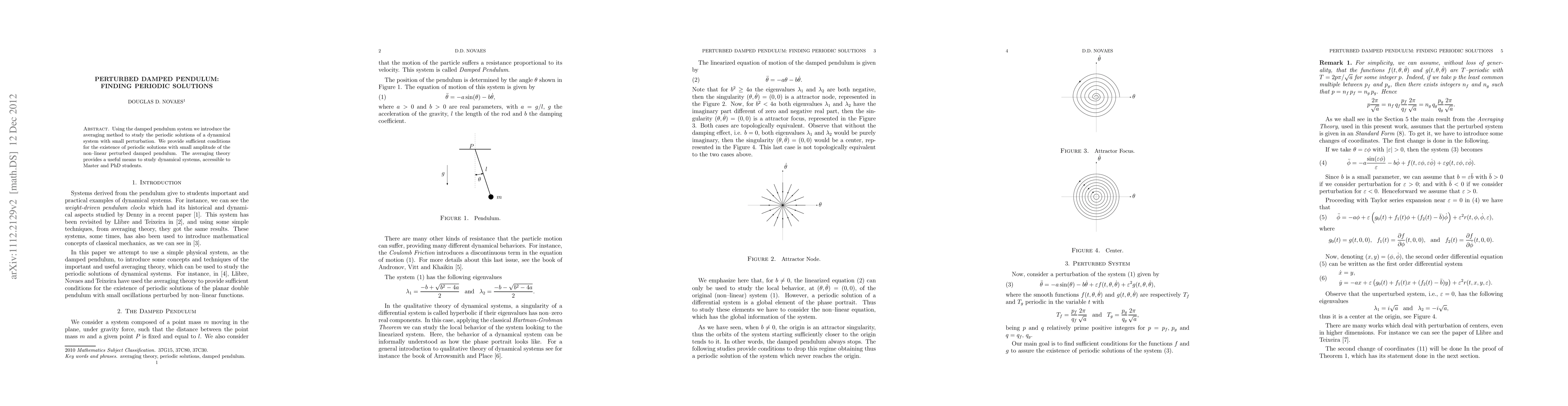 Using the damped pendulum system we introduce the averaging method to study the periodic solutions of a dynamical system with small perturbation. We provide sufficient conditions for the existence of periodic solutions with small amplitude of the non--linear perturbed damped pendulum. The averaging theory provides a useful means to study dynamical systems, accessible to Master and PhD students.