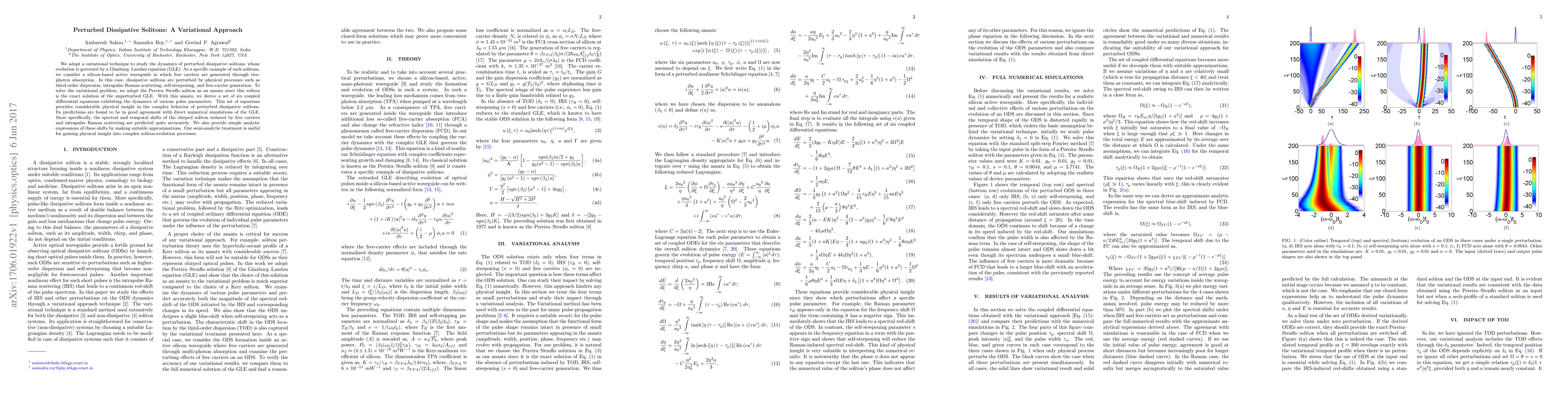 We adopt a variational technique to study the dynamics of perturbed dissipative solitons, whose evolution is governed by a Ginzburg--Landau equation (GLE). As a specific example of such solitons, we consider a silicon-based active waveguide in which free carriers are generated through two-photon absorption. In this case, dissipative solitons are perturbed by physical processes such as third-order dispersion, intrapulse Raman scattering, self-steepening, and free-carrier generation. To solve the variational problem, we adopt the Pereira--Stenflo soliton as an ansatz since this soliton is the exact solution of the unperturbed GLE. With this ansatz, we derive a set of six coupled differential equations exhibiting the dynamics of various pulse parameters. This set of equations provides considerable physical insight in the complex behavior of perturbed dissipative solitons. Its predictions are found to be in good agreement with direct numerical simulations of the GLE. More specifically, the spectral and temporal shifts of the chirped soliton induced by free carriers and intrapulse Raman scattering are predicted quite accurately. We also provide simple analytic expressions of these shifts by making suitable approximations. Our semi-analytic treatment is useful for gaining physical insight into complex soliton-evolution processes.