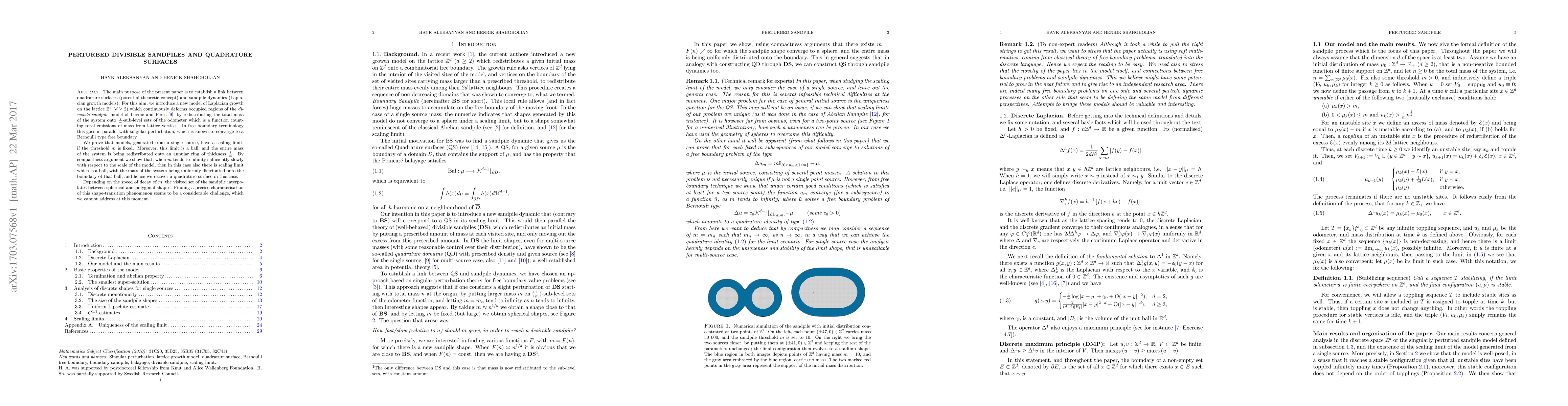 This paper establishes a connection between quadrature surfaces and sandpile dynamics, introducing a perturbed divisible sandpile model that redistributes mass onto sub-level sets. It demonstrates a scaling limit to a ball, with mass distribution forming a quadrature surface when the threshold parameter decays sufficiently slowly.