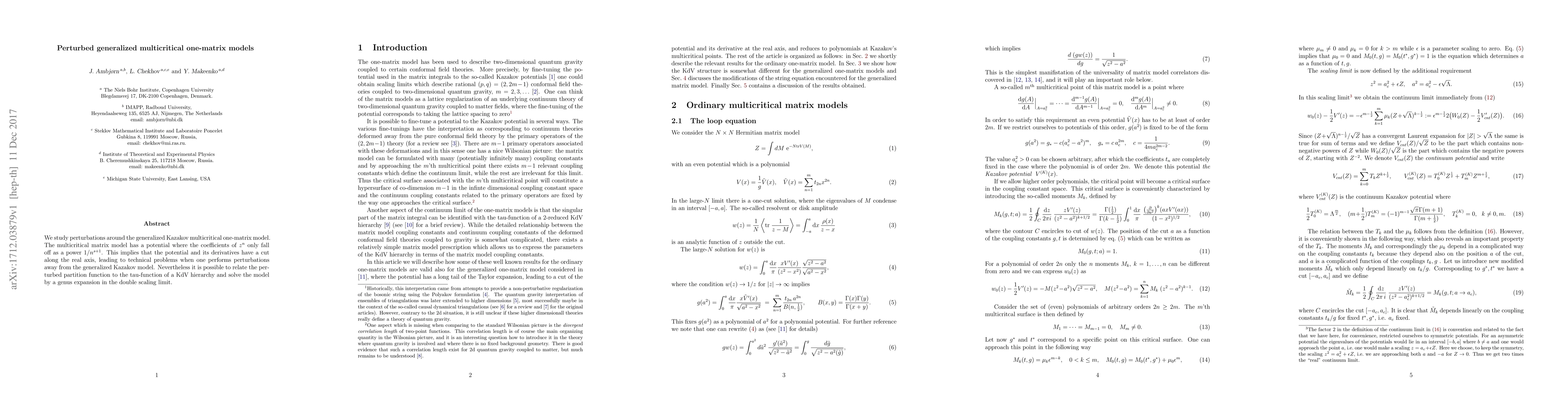 This paper investigates perturbations of the generalized Kazakov multicritical one-matrix model, which features a potential with slow decay. Despite the technical challenges due to a real axis cut in the potential, the authors relate the perturbed partition function to the tau-function of a KdV hierarchy and solve it via a genus expansion in the double scaling limit.
