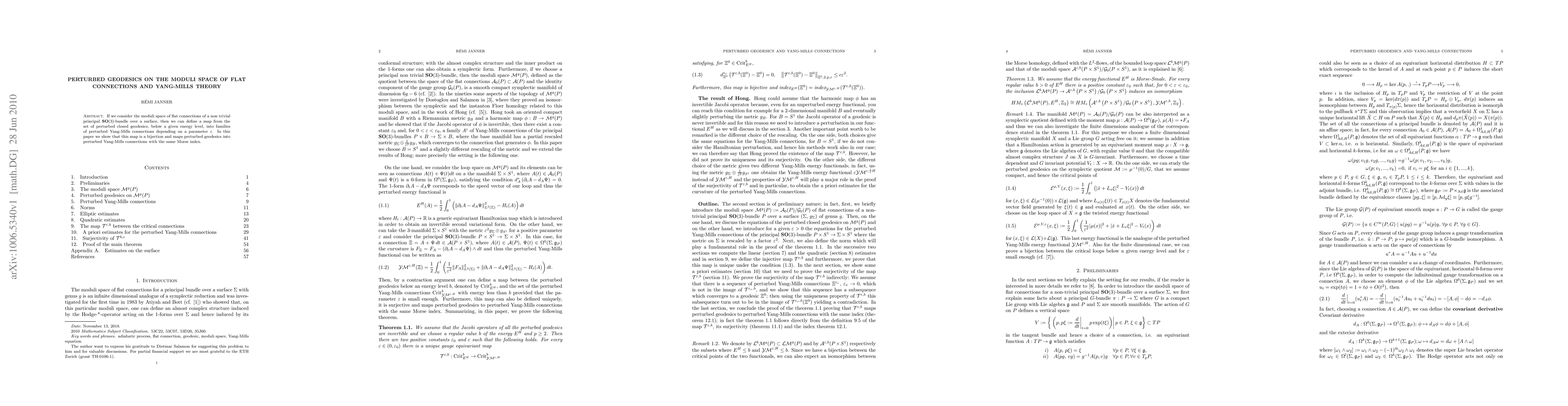 If we consider the moduli space of flat connections of a non trivial principal SO(3)-bundle over a surface, then we can define a map from the set of perturbed closed geodesics, below a given energy level, into families of perturbed Yang-Mills connections depending on a small parameter. In this paper we show that this map is a bijection and maps perturbed geodesics into perturbed Yang-Mills connections with the same Morse index.