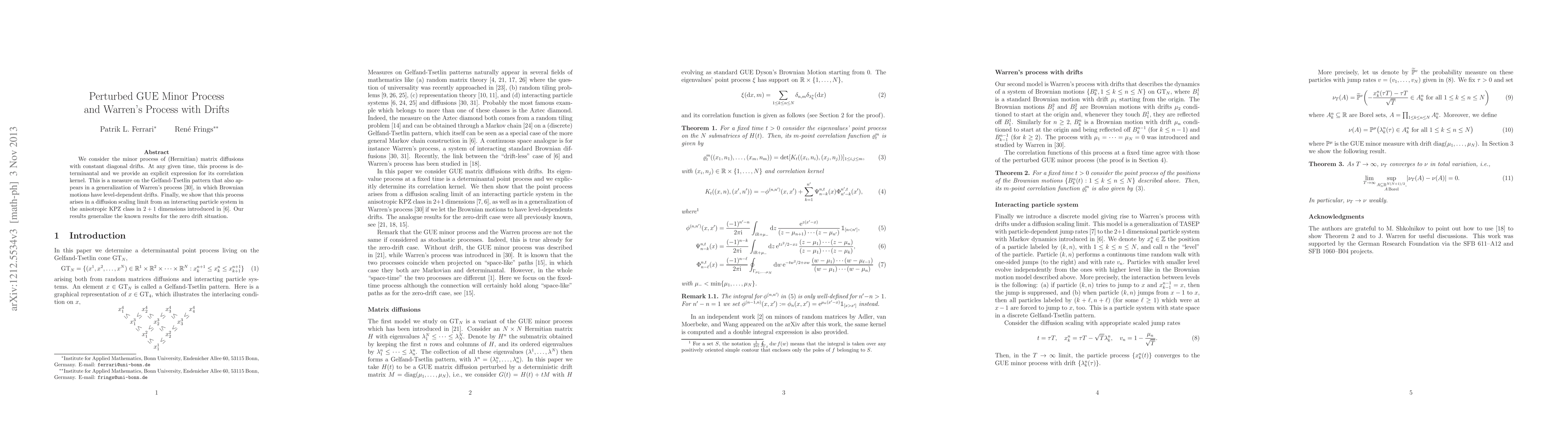 Researchers studied a process of matrix diffusion with constant diagonal drifts, finding an explicit expression for its correlation kernel that also appears in Warren's process with level-dependent drifts. The result arises from the diffusion scaling limit of an interacting particle system in 2+1 dimensions.