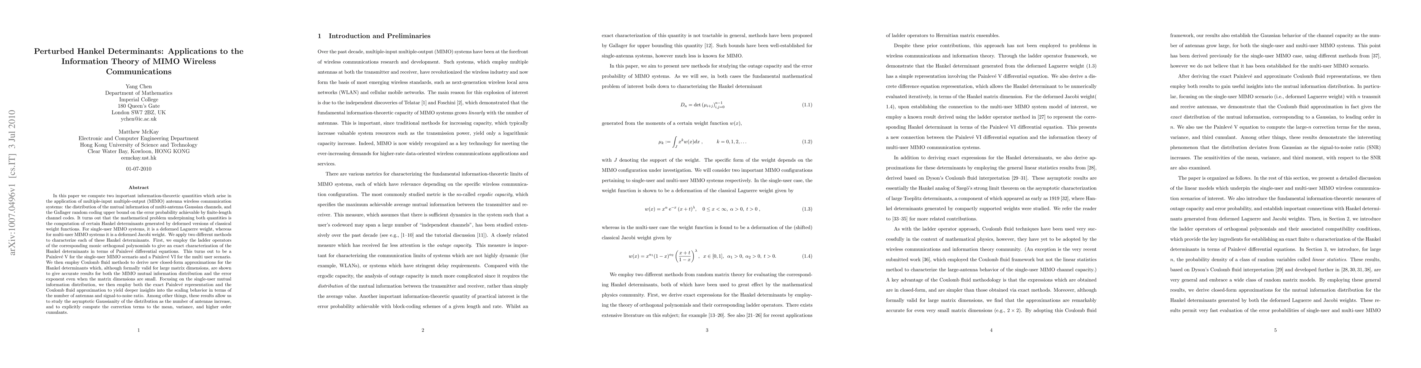 This paper computes mutual information distributions and error probabilities in MIMO wireless systems using perturbed Hankel determinants. It employs ladder operators and Coulomb fluid methods to characterize these determinants, revealing Painlevé V and VI equations and providing accurate approximations for small matrix dimensions.