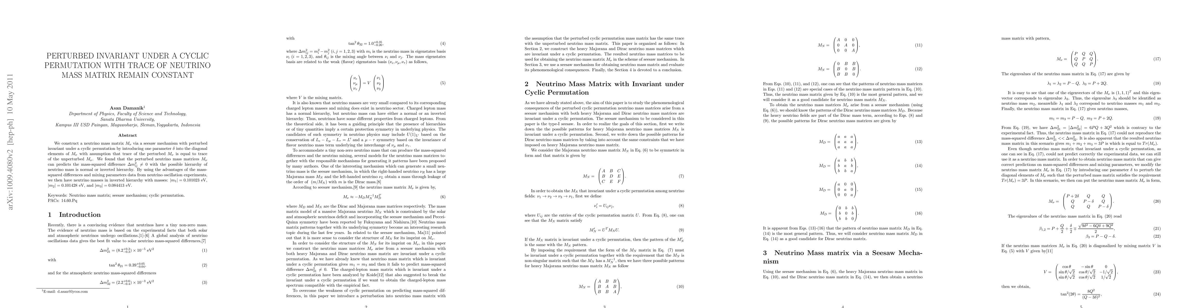 We construct a neutrino mass matrix $M_{\nu}$ via a seesaw mechanism whith perturbed invariant under a cyclic permutation by introducing one parameter $\delta$ into the diagonal elements of $M_{\nu}$ with assumption that trace of the perturbed $M_{\nu}$ is equal to trace of the unperturbed $M_{\nu}$. We found that the perturbed neutrino mass matrices $M_{\nu}$ can predicts the mass-squared difference $\Delta m_{ij}^{2}\neq 0$ with the possible hierarchy of neutrino mass is normal or inverted hierarchy. By using the advantages of the mass-squared differences and mixing parameters data from neutrino oscillaton experiments, we obtained neutrino masses in inverted hierarchy with masses: $|m_{1}|=0.101023$ eV, $|m_{2}|=0.101428$ eV, and $|m_{3}|=0.084413$ eV.