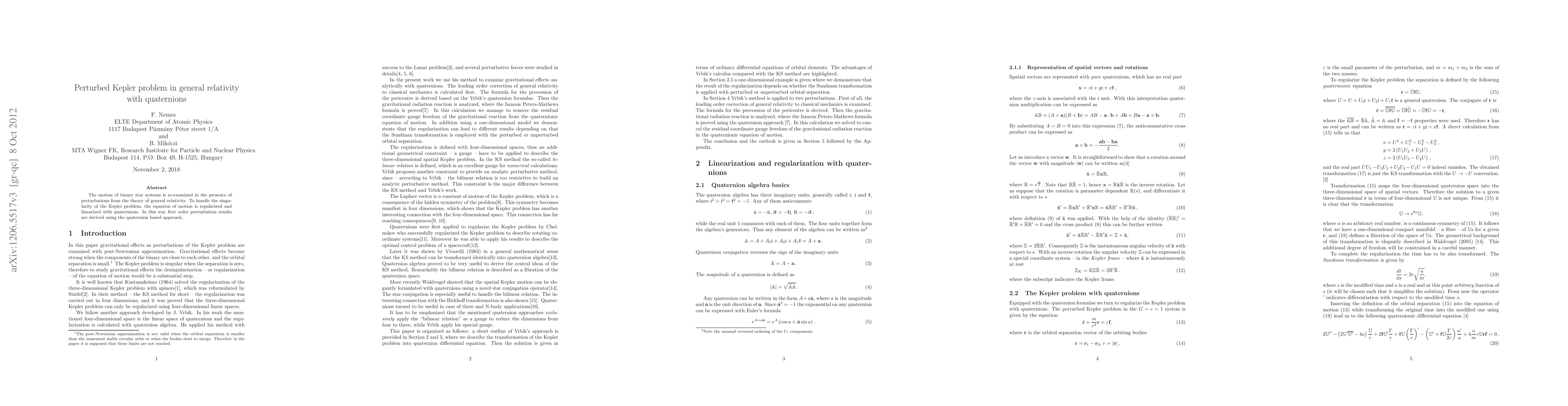 This paper examines binary star systems under general relativity, regularizing and linearizing the Kepler problem using quaternions to derive first-order perturbation results. The approach provides a novel framework for understanding relativistic effects in binary systems.