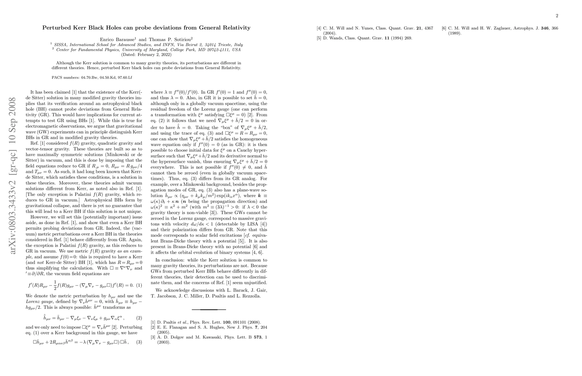 Summary: This paper explores how perturbations in Kerr black holes can reveal deviations from General Relativity, as different gravity theories yield distinct perturbations despite sharing the same unperturbed Kerr solution.