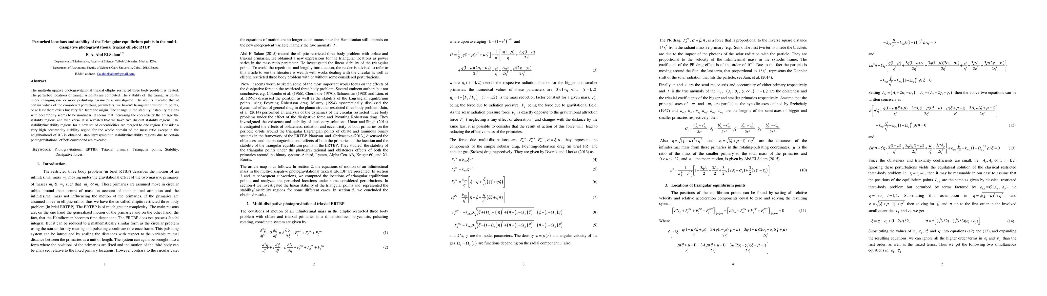 The multi-dissipative photogravitational triaxial elliptic restricted three body problem is treated. The perturbed locations of triangular points are computed. The stability of the triangular points under changing one or more perturbing parameter is investigated. The results revealed that at certain values of the considered perturbing parameters, we haven't triangular equilibrium points, or at least there exists but very far from the origin. The change in the stability/instability regions with eccentricity seems to be nonlinear. It seems that increasing the eccentricity the enlarge the stability regions and vice versa. It is revealed that we have two disjoint stability regions. The stability/instability regions for a new set of eccentricities are merged to one region. Consider a very high eccentricity stability region for the whole domain of the mass ratio except in the neighborhood of 0.3 is obtained. stability/asymptotic stability/instability regions due to certain photogravitational effects correspond are revealed.
