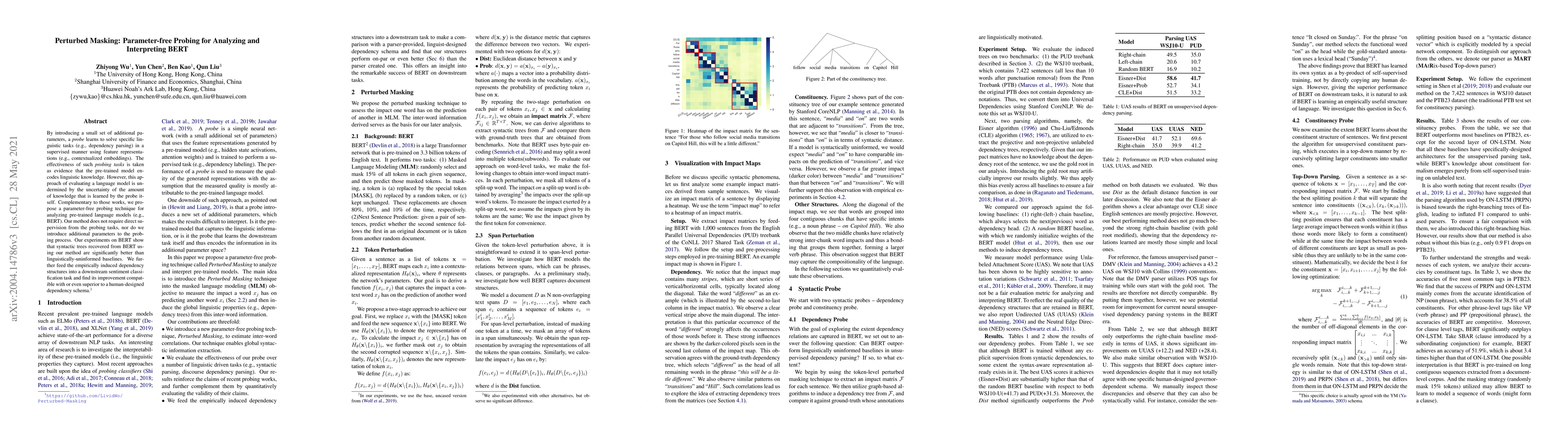 This paper proposes a parameter-free probing technique for analyzing pre-trained language models like BERT without requiring additional parameters or direct supervision. Experiments show that the method recovers syntactic trees better than baselines and improves sentiment classification, rivaling human-designed dependency schemas.