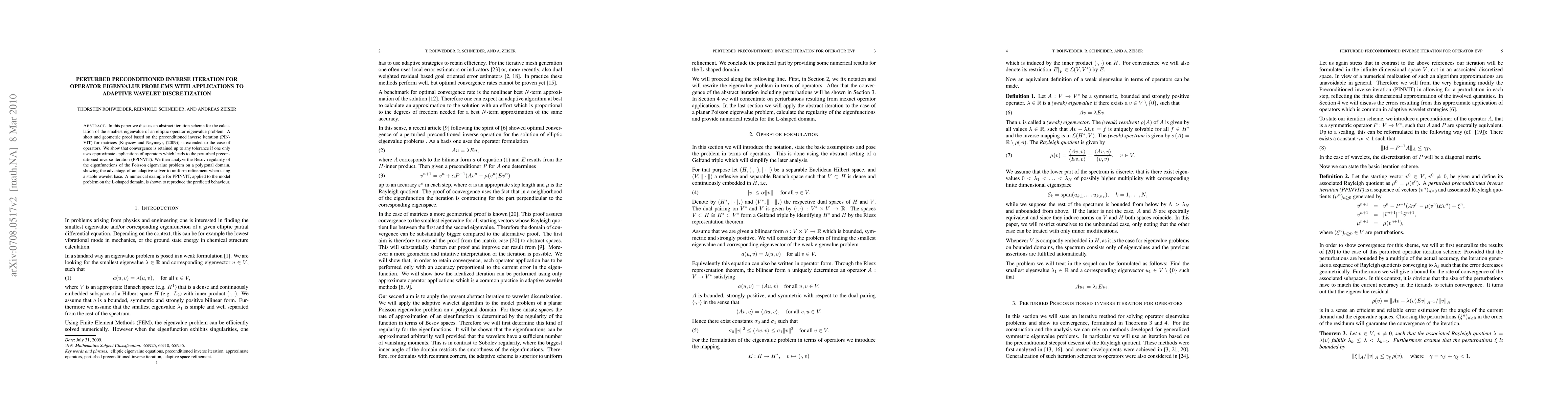 In this paper we discuss an abstract iteration scheme for the calculation of the smallest eigenvalue of an elliptic operator eigenvalue problem. A short and geometric proof based on the preconditioned inverse iteration (PINVIT) for matrices [Knyazev and Neymeyr, (2009)] is extended to the case of operators. We show that convergence is retained up to any tolerance if one only uses approximate applications of operators which leads to the perturbed preconditioned inverse iteration (PPINVIT). We then analyze the Besov regularity of the eigenfunctions of the Poisson eigenvalue problem on a polygonal domain, showing the advantage of an adaptive solver to uniform refinement when using a stable wavelet base. A numerical example for PPINVIT, applied to the model problem on the L-shaped domain, is shown to reproduce the predicted behaviour.