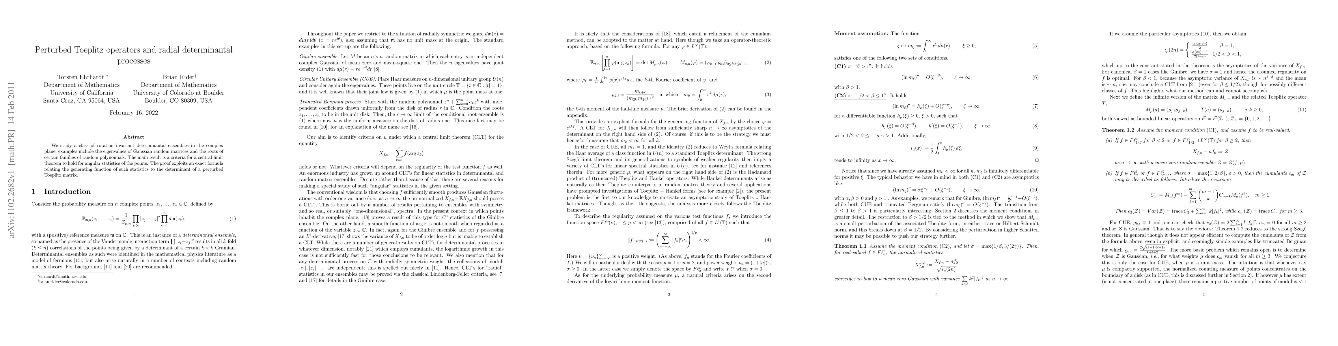 This paper investigates rotation invariant determinantal ensembles in the complex plane, focusing on criteria for central limit theorems in angular statistics. It establishes a connection between the generating function of these statistics and the determinant of a perturbed Toeplitz matrix.