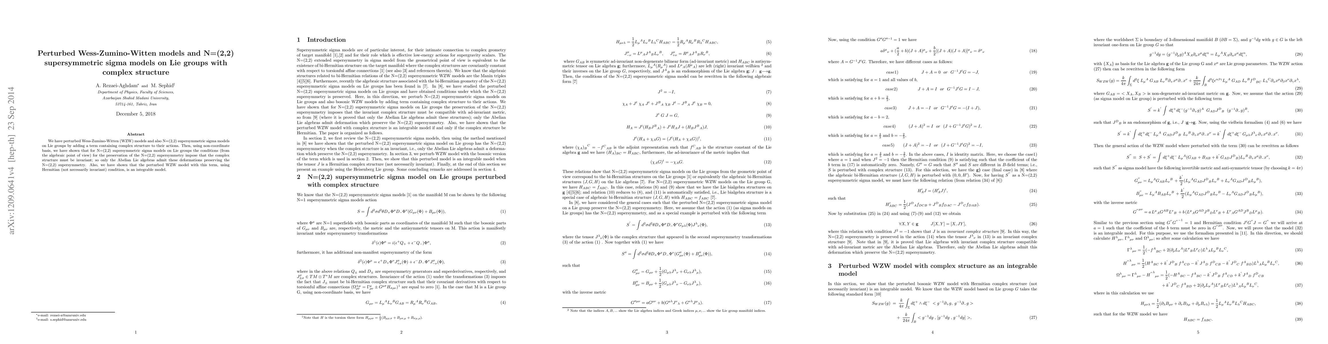 This paper investigates perturbed Wess-Zumino-Witten and N=(2,2) supersymmetric sigma models on Lie groups, revealing that for the latter, only Abelian Lie algebras preserve N=(2,2) supersymmetry under the added complex structure. The perturbed WZW model is shown to remain integrable under a Hermitian condition.