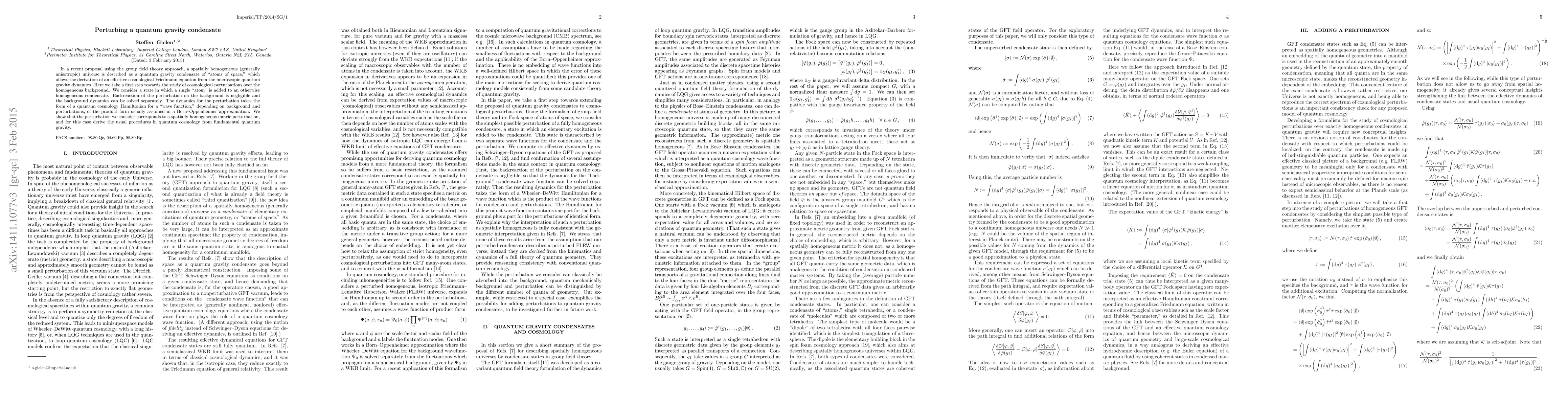 This paper explores cosmological perturbations in a quantum gravity condensate model using group field theory, where a homogeneous universe is treated as a condensate of "atoms of space." It examines the dynamics of a single added "atom," demonstrating that the perturbation corresponds to a spatially homogeneous metric perturbation and derives quantum cosmology procedures from fundamental quantum gravity.