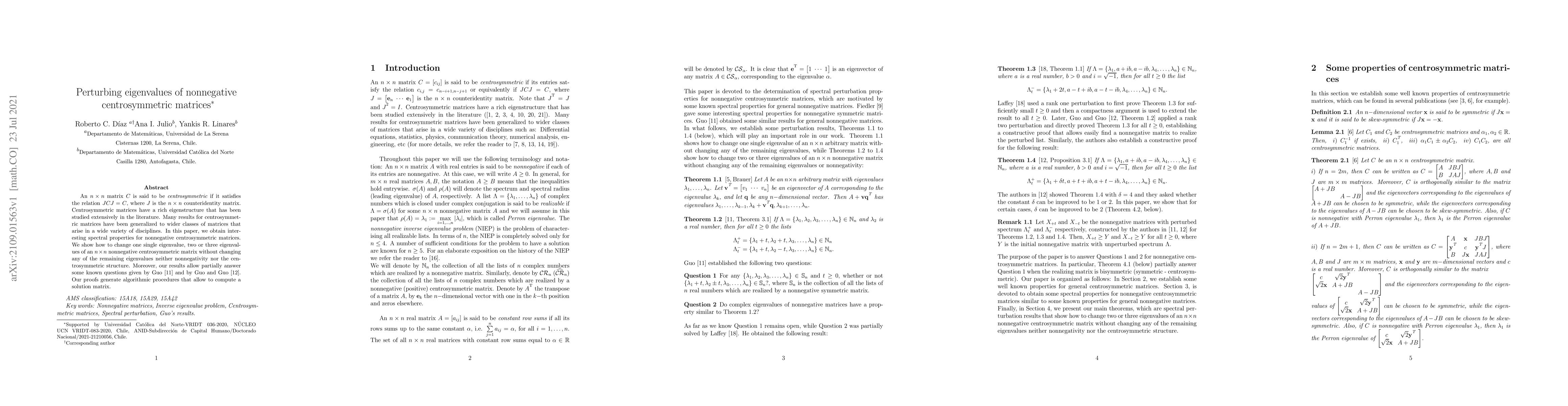 This paper investigates spectral properties of nonnegative centrosymmetric matrices, demonstrating how to perturb one, two, or three eigenvalues without altering the remaining eigenvalues, nonnegativity, or centrosymmetric structure. The findings also provide partial answers to questions posed by Guo and Guo, with proofs yielding algorithmic procedures for computing the solution matrix.