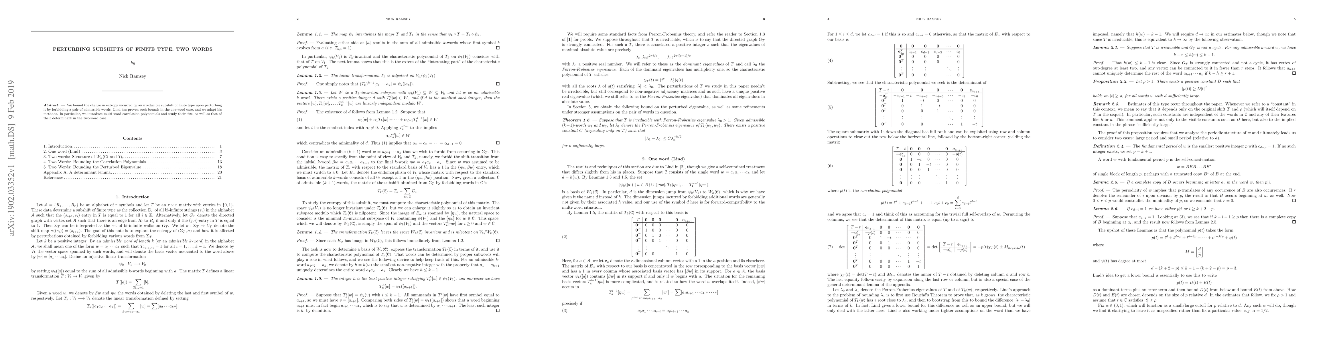 We bound the change in entropy incurred by an irreducible subshift of finite type upon perturbing it by forbidding a pair of admissible words. Lind has proven such bounds in the one-word case, and we adapt his methods. In particular, we introduce multi-word correlation polynomials and study their size, as well as that of their determinant in the two-word case.