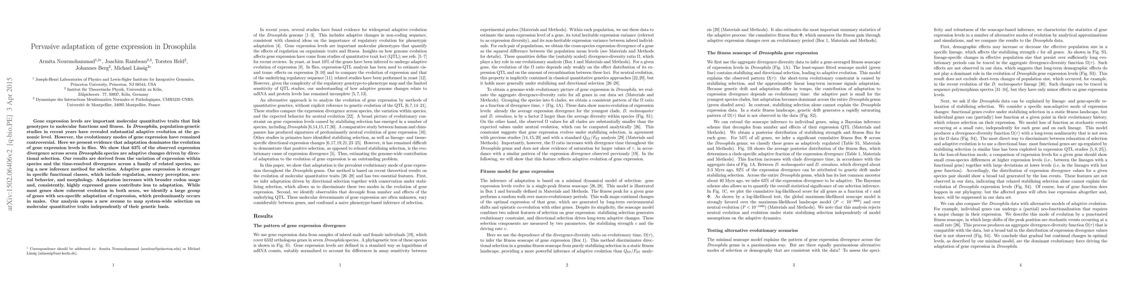 This study demonstrates that adaptive evolution significantly influences gene expression levels in Drosophila, with 63% of expression divergence across species being driven by directional selection. This finding highlights the pervasive role of adaptation in shaping gene expression and identifies sex-specific adaptive changes, predominantly in males.