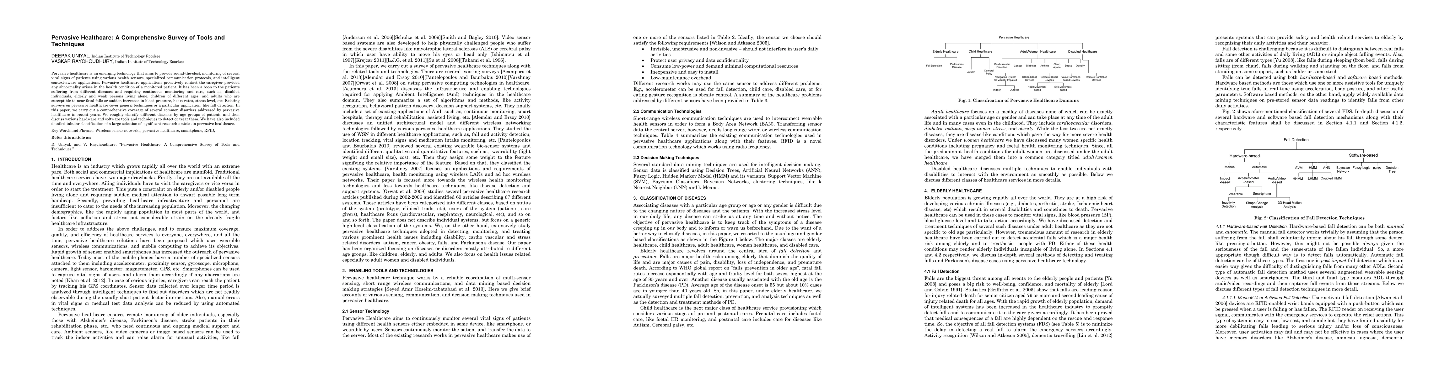 This paper provides a comprehensive survey of pervasive healthcare tools and techniques, focusing on monitoring vital signs and addressing various disorders across different age groups. It classifies diseases and discusses both hardware and software solutions, supplemented by a detailed tabular classification of significant research articles.