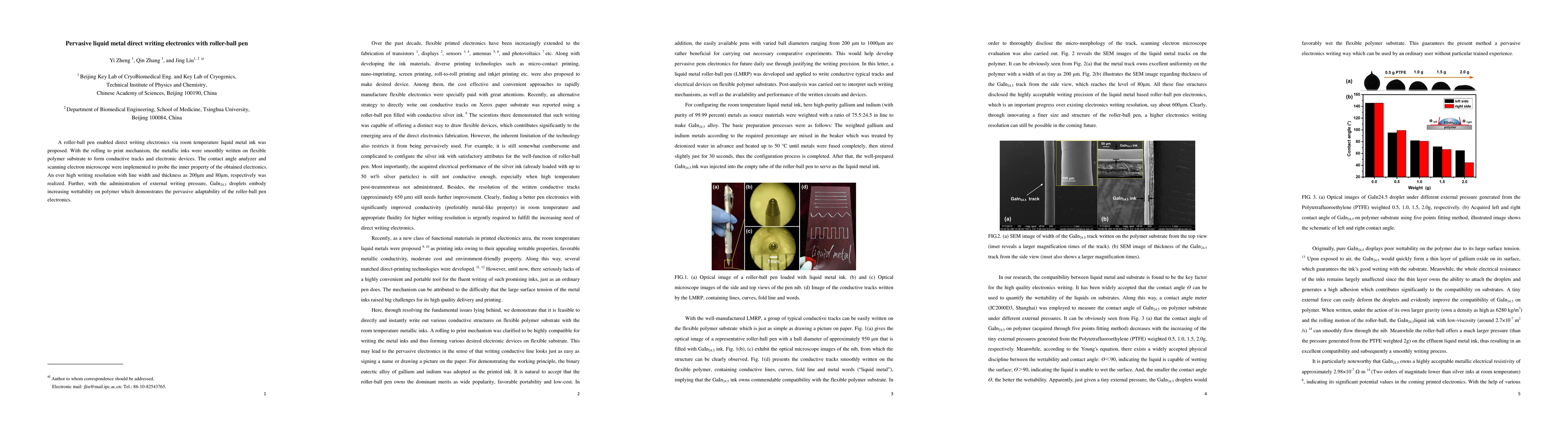 The development of a liquid metal roller-ball pen for high-resolution, metallic conductivity direct writing on flexible polymer substrates.