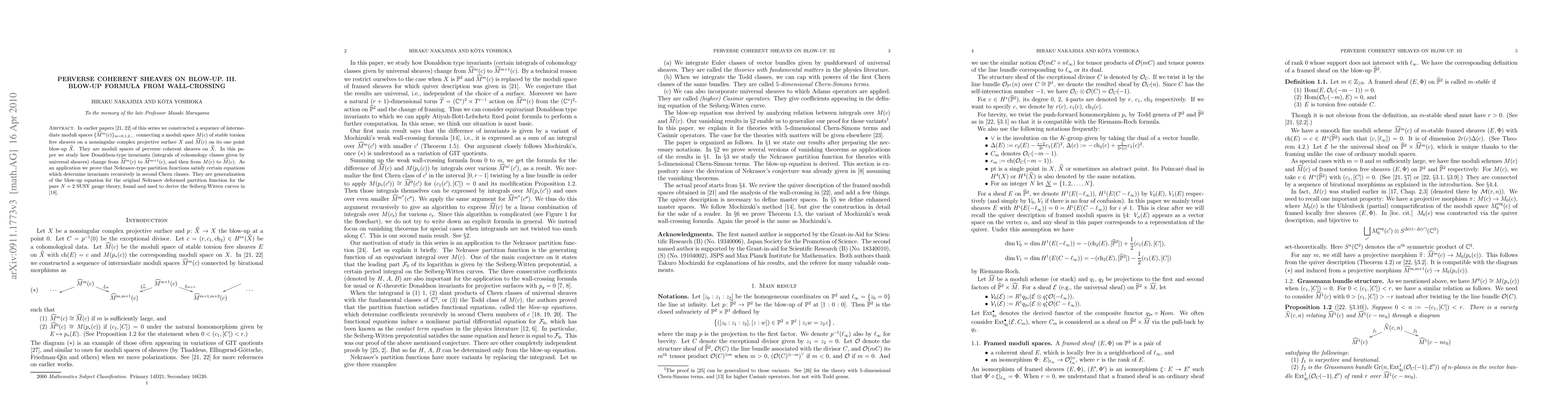 In earlier papers arXiv:0802.3120, arXiv:0806.0463 of this series we constructed a sequence of intermediate moduli spaces $\bM^m(c)$ connecting a moduli space $M(c)$ of stable torsion free sheaves on a nonsingular complex projective surface and $\bM(c)$ on its one point blow-up. They are moduli spaces of perverse coherent sheaves on the blow-up. In this paper we study how Donaldson-type invariants (integrals of cohomology classes given by universal sheaves) change from $\bM^m(c)$ to $\bM^{m+1}(c)$, and then from $M(c)$ to $\bM(c)$. As an application we prove that Nekrasov-type partition functions satisfy certain equations which determine invariants recursively in second Chern classes. They are generalization of the blow-up equation for the original Nekrasov deformed partition function for the pure N=2 SUSY gauge theory, found and used to derive the Seiberg-Witten curves in arXiv:math/0306198.