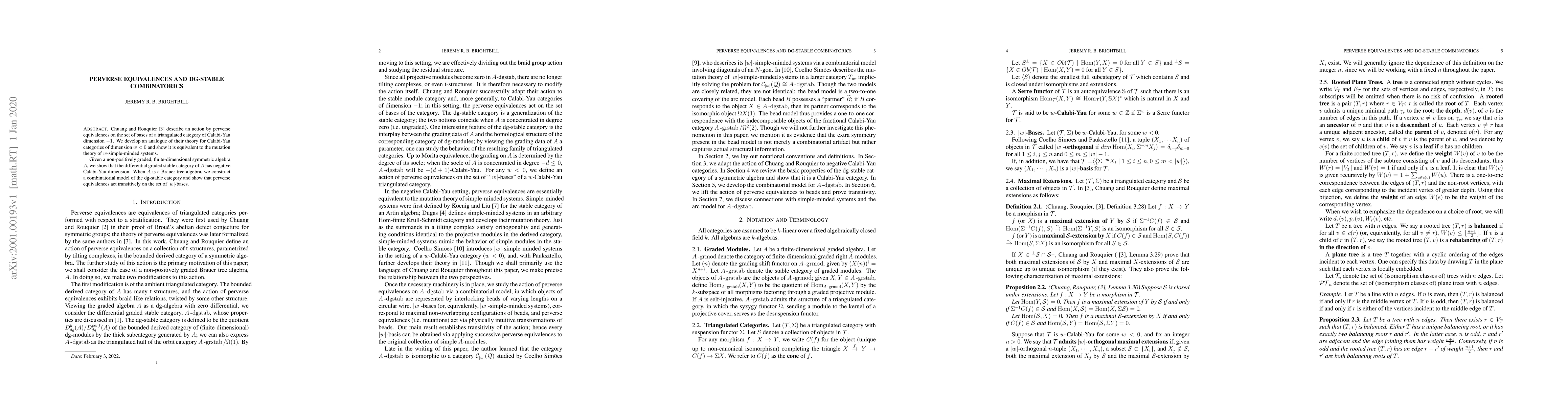 Chuang and Rouquier describe an action by perverse equivalences on the set of bases of a triangulated category of Calabi-Yau dimension $-1$. We develop an analogue of their theory for Calabi-Yau categories of dimension $w<0$ and show it is equivalent to the mutation theory of $w$-simple-minded systems. Given a non-positively graded, finite-dimensional symmetric algebra $A$, we show that the differential graded stable category of $A$ has negative Calabi-Yau dimension. When $A$ is a Brauer tree algebra, we construct a combinatorial model of the dg-stable category and show that perverse equivalences act transitively on the set of $|w|$-bases.