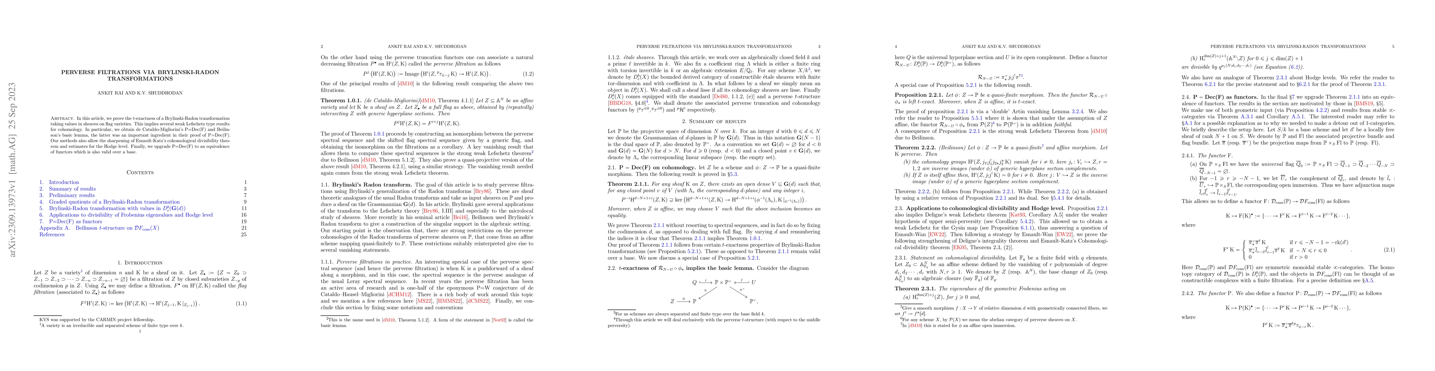 In this article, we prove the $t$-exactness of a Brylinski-Radon transformation taking values in sheaves on flag varieties. This implies several weak Lefschetz type results for cohomology. In particular, we obtain de Cataldo-Migliorini's P=Dec(F) and Beilinson's basic lemma, the latter was an important ingredient in their proof of P=Dec(F). Our methods also allow the sharpening of Esnault-Katz's cohomological divisibility theorem and estimates for the Hodge level. Finally, we upgrade P=Dec(F) to an equivalence of functors which is also valid over a base.