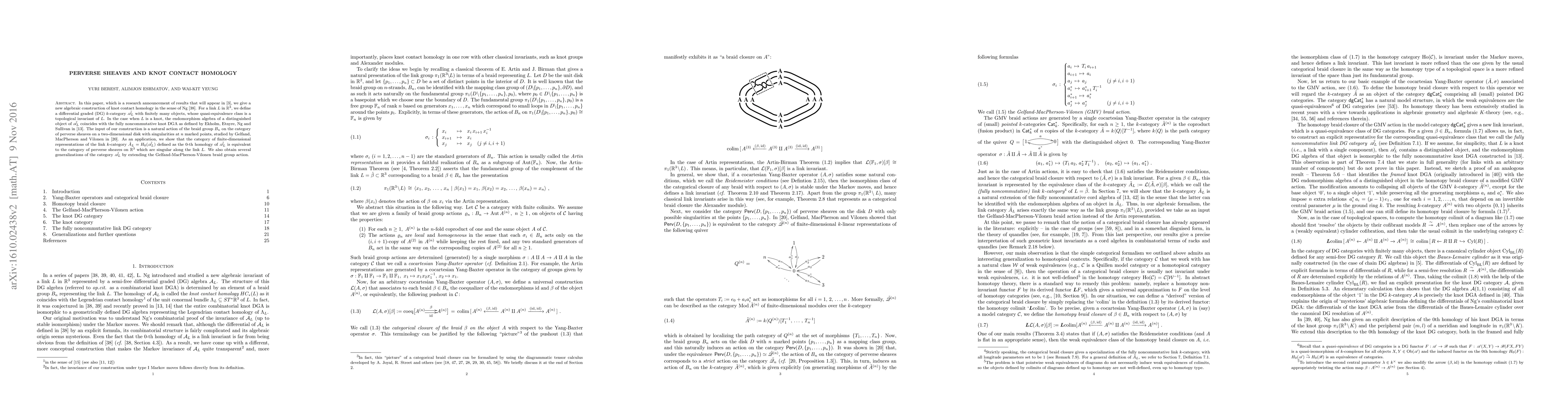 In this paper, which is mostly a research announcement, we give a new algebraic construction of knot contact homology in the sense of L. Ng [Ng05a]. For a link $L$ in $ {\mathbb R}^3 $, we define a differential graded (DG) $k$-category $ \tilde{\mathscr A} $ with finitely many objects, whose quasi-equivalence class is a topological invariant of $ L $. In the case when $L$ is a knot, the endomorphism algebra of a distinguished object of $ \tilde{\mathscr A} $ coincides with the fully noncommutative knot DGA as defined by Ekholm, Etnyre, Ng and Sullivan in [EENS13a]. The input of our construction is a natural action of the braid group $B_n$ on the category of perverse sheaves on a two-dimensional disk with singularities at $n$ marked points, studied by Gelfand, MacPherson and Vilonen in [GMV96]. As an application, we show that the category of finite-dimensional representations of the link $k$-category $ \tilde{A} = H_0(\tilde{\mathscr A}) $ defined as the $0$th homology of our DG category $ \tilde{\mathscr A} $ is equivalent to the category of perverse sheaves on $ {\mathbb R}^3 $ which are singular along the link $ L $. We also obtain several generalizations of the category $ \tilde{\mathscr A} $ by extending the Gelfand-MacPherson-Vilonen braid action.