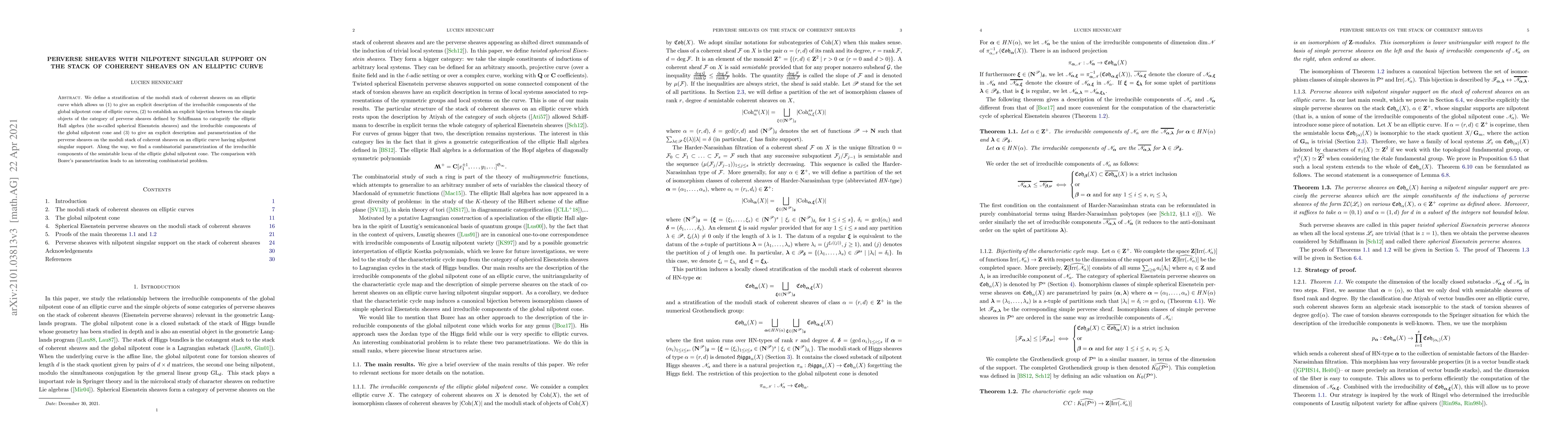 This paper introduces a stratification of the moduli stack of coherent sheaves on an elliptic curve, providing an explicit description of its irreducible components and establishing a bijection between certain perverse sheaves and these components, ultimately facilitating the parametrization of perverse sheaves with nilpotent singular support.