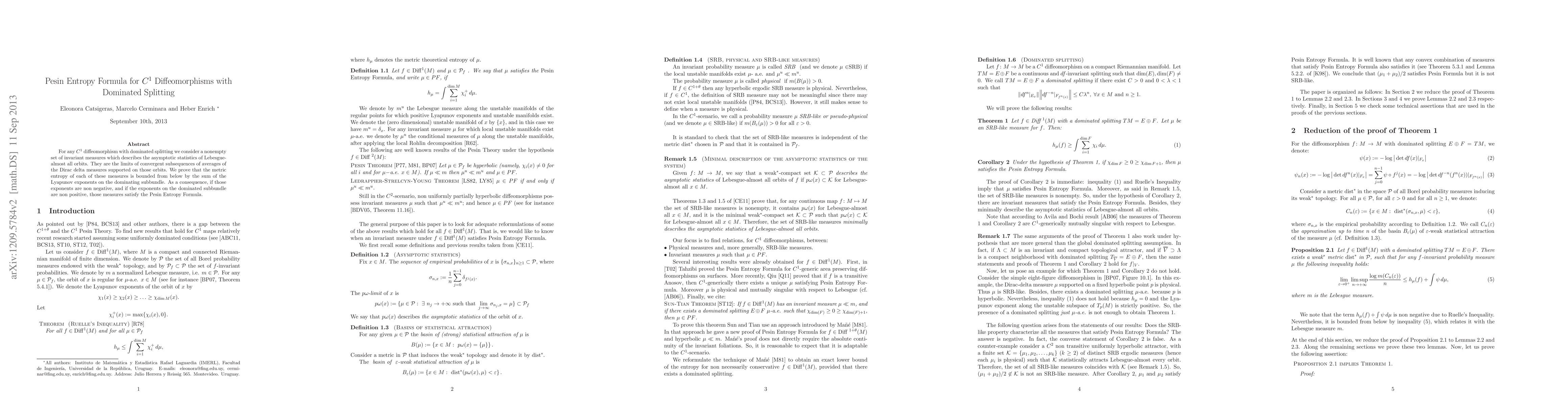 For any C1 diffeomorphism with dominated splitting we consider a nonempty set of invariant measures which describes the asymptotic statistics of Lebesgue-almost all orbits. They are the limits of convergent subsequences of averages of the Dirac delta measures supported on those orbits. We prove that the metric entropy of each of these measures is bounded from below by the sum of the Lyapunov exponents on the dominating subbundle. As a consequence, if those exponents are non negative, and if the exponents on the dominated subbundle are non positive, those measures satisfy the Pesin Entropy Formula.