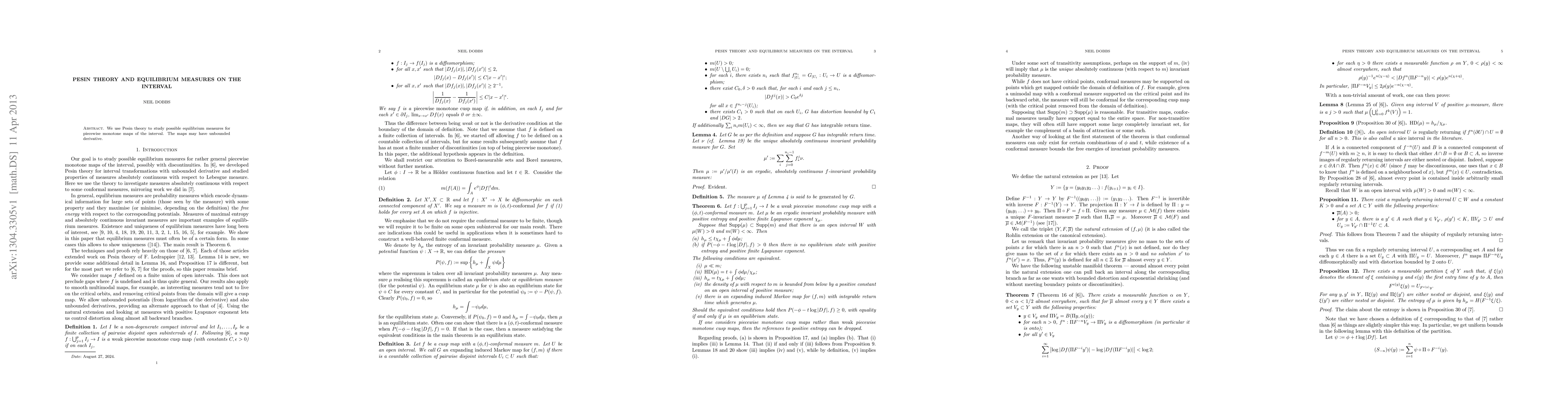 Summary: This paper applies Pesin theory to investigate equilibrium measures for piecewise monotone maps on the interval, even when the maps have unbounded derivatives. The study focuses on understanding the properties of these equilibrium measures.
