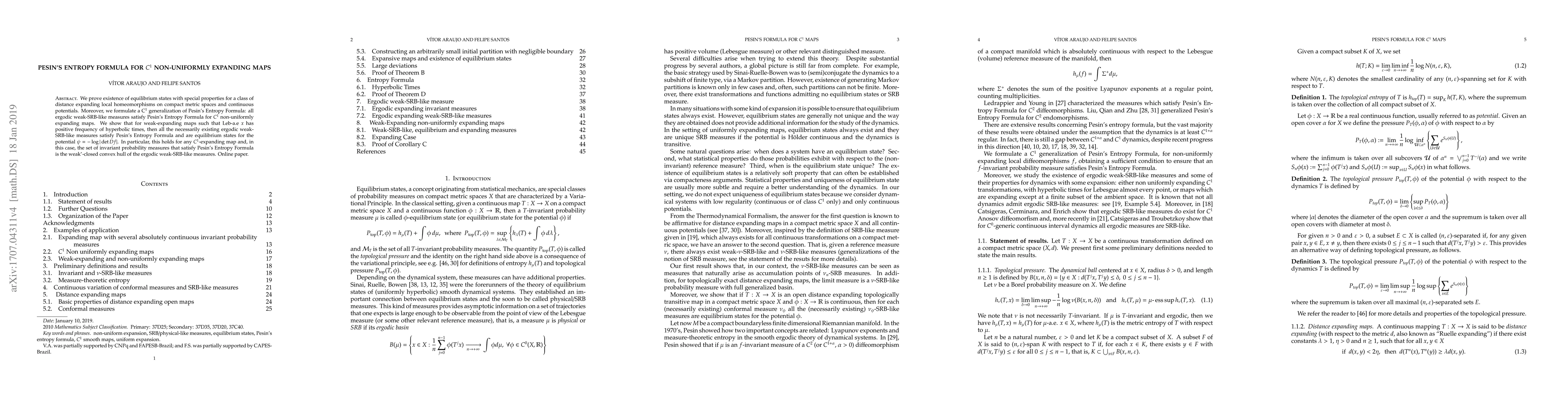 The research employs a rigorous mathematical analysis, proving the existence of equilibrium states with special properties for a class of distance expanding local homeomorphisms on compact metric spaces using continuous potentials. It also presents a C¹ generalization of Pesin's Entropy Formula.