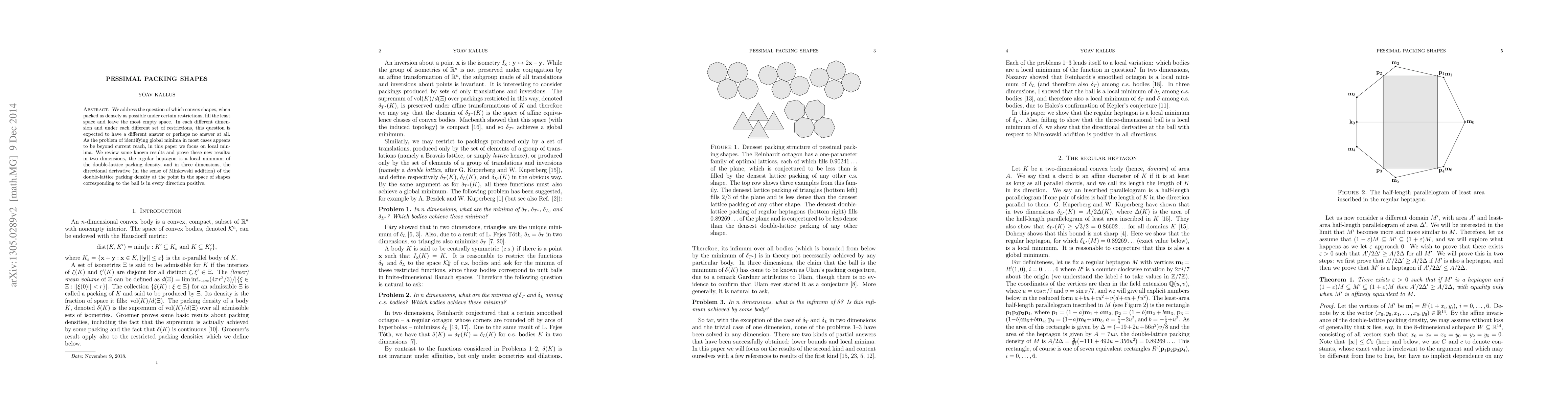 We address the question of which convex shapes, when packed as densely as possible under certain restrictions, fill the least space and leave the most empty space. In each different dimension and under each different set of restrictions, this question is expected to have a different answer or perhaps no answer at all. As the problem of identifying global minima in most cases appears to be beyond current reach, in this paper we focus on local minima. We review some known results and prove these new results: in two dimensions, the regular heptagon is a local minimum of the double-lattice packing density, and in three dimensions, the directional derivative (in the sense of Minkowski addition) of the double-lattice packing density at the point in the space of shapes corresponding to the ball is in every direction positive.