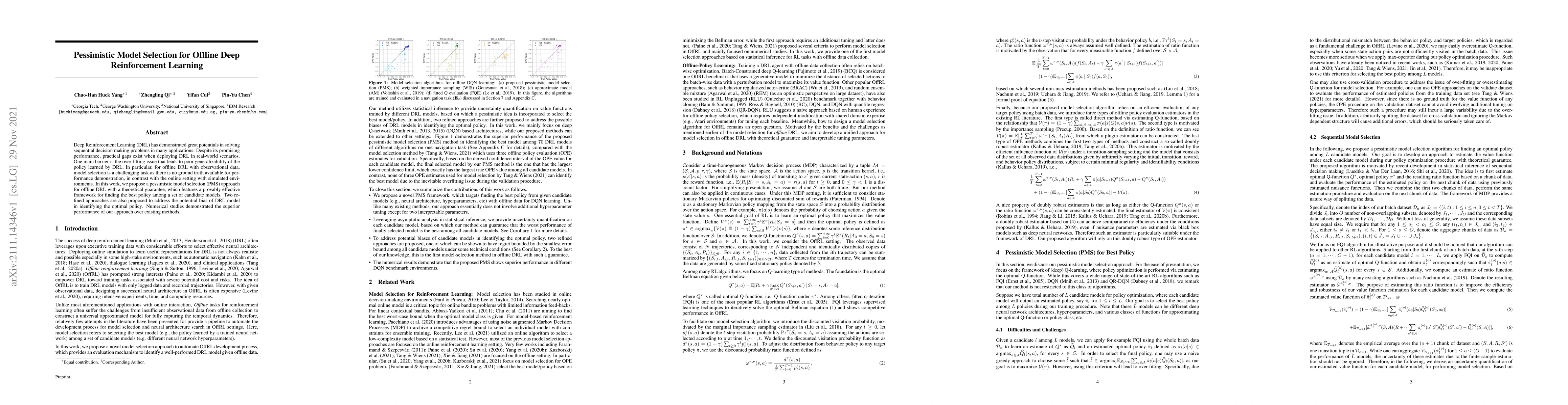 This paper proposes a pessimistic model selection (PMS) approach for offline Deep Reinforcement Learning (DRL) to address overfitting and improve generalizability. The proposed method provides a theoretical framework for selecting the best policy from candidate models, with refined techniques to mitigate bias, and outperforms existing methods in numerical studies.