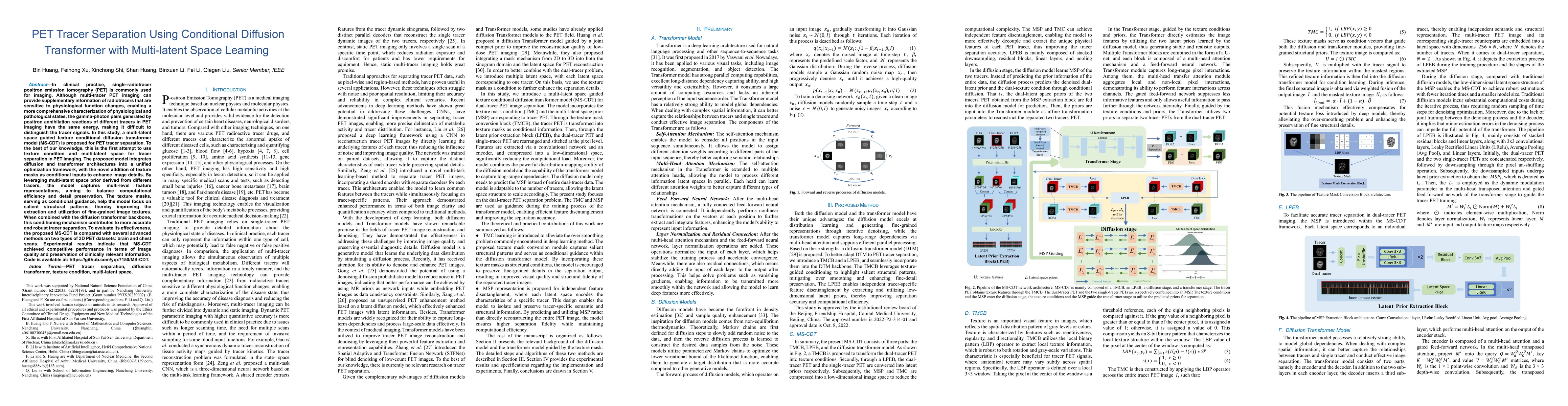 In clinical practice, single-radiotracer positron emission tomography (PET) is commonly used for imaging. Although multi-tracer PET imaging can provide supplementary information of radiotracers that are sensitive to physiological function changes, enabling a more comprehensive characterization of physiological and pathological states, the gamma-photon pairs generated by positron annihilation reactions of different tracers in PET imaging have the same energy, making it difficult to distinguish the tracer signals. In this study, a multi-latent space guided texture conditional diffusion transformer model (MS-CDT) is proposed for PET tracer separation. To the best of our knowledge, this is the first attempt to use texture condition and multi-latent space for tracer separation in PET imaging. The proposed model integrates diffusion and transformer architectures into a unified optimization framework, with the novel addition of texture masks as conditional inputs to enhance image details. By leveraging multi-latent space prior derived from different tracers, the model captures multi-level feature representations, aiming to balance computational efficiency and detail preservation. The texture masks, serving as conditional guidance, help the model focus on salient structural patterns, thereby improving the extraction and utilization of fine-grained image textures. When combined with the diffusion transformer backbone, this conditioning mechanism contributes to more accurate and robust tracer separation. To evaluate its effectiveness, the proposed MS-CDT is compared with several advanced methods on two types of 3D PET datasets: brain and chest scans. Experimental results indicate that MS-CDT achieved competitive performance in terms of image quality and preservation of clinically relevant information. Code is available at: https://github.com/yqx7150/MS-CDT.