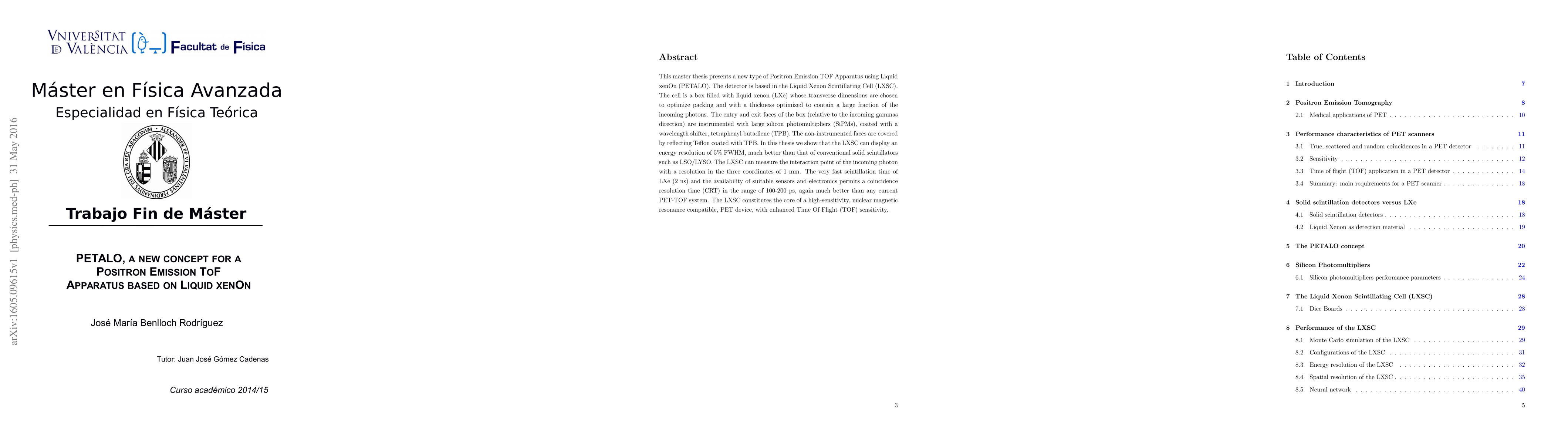 This master thesis presents a new type of Positron Emission TOF Apparatus using Liquid xenOn (PETALO). The detector is based in the Liquid Xenon Scintillating Cell (LXSC). The cell is a box filled with liquid xenon (LXe) whose transverse dimensions are chosen to optimize packing and with a thickness optimized to contain a large fraction of the incoming photons. The entry and exit faces of the box (relative to the incoming gammas direction) are instrumented with large silicon photomultipliers (SiPMs), coated with a wavelength shifter, tetraphenyl butadiene (TPB). The non-instrumented faces are covered by reflecting Teflon coated with TPB. In this thesis we show that the LXSC can display an energy resolution of 5% FWHM, much better than that of conventional solid scintillators such as LSO/LYSO. The LXSC can measure the interaction point of the incoming photon with a resolution in the three coordinates of 1 mm. The very fast scintillation time of LXe (2 ns) and the availability of suitable sensors and electronics permits a coincidence resolution time (CRT) in the range of 100-200 ps, again much better than any current PET-TOF system. The LXSC constitutes the core of a high-sensitivity, nuclear magnetic resonance compatible, PET device, with enhanced Time Of Flight (TOF) sensitivity.
