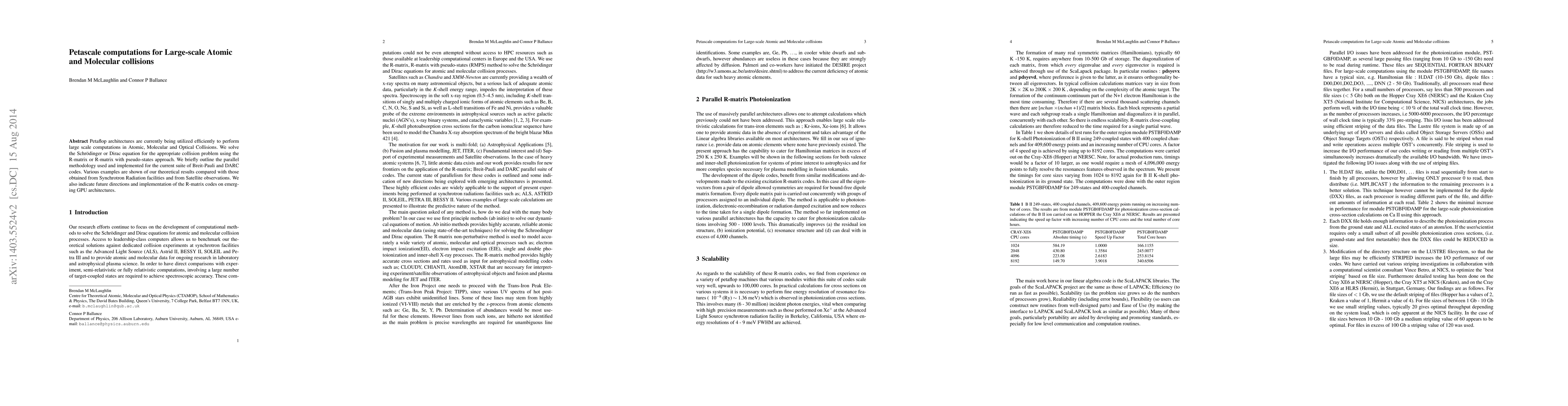 This paper explores the use of petascale computing to solve the Schrödinger or Dirac equations for large-scale atomic and molecular collisions, employing R-matrix and pseudo-state methods. It outlines the parallel methodologies used in Breit-Pauli and DARC codes and compares theoretical results with experimental data from synchrotron and satellite observations, while also discussing future GPU implementations.