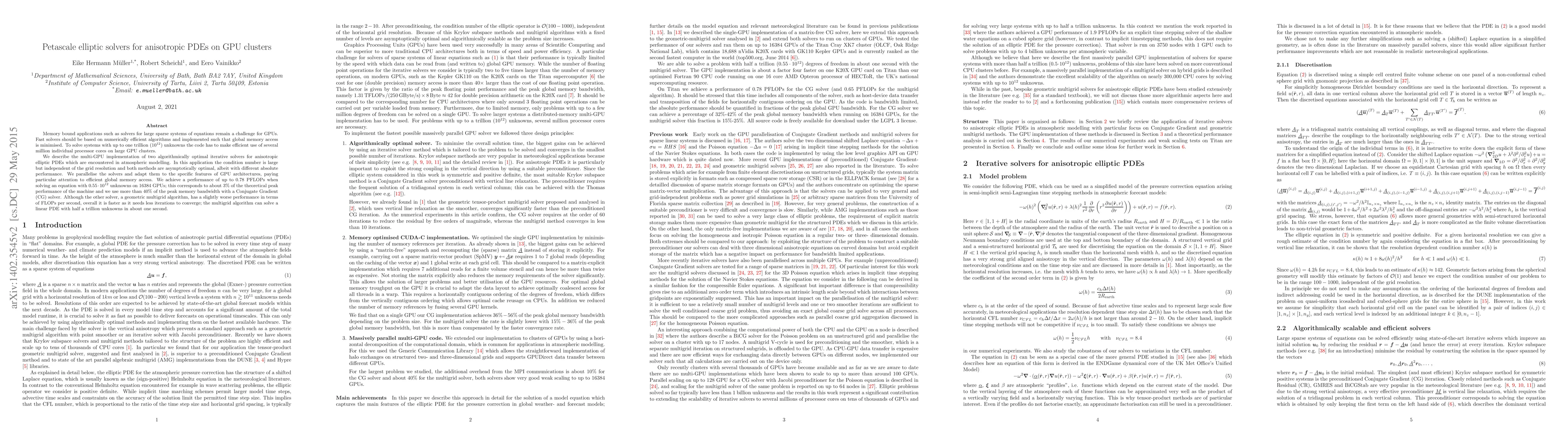 This paper presents a multi-GPU implementation of two iterative solvers for anisotropic elliptic PDEs, focusing on efficient memory usage and high performance on GPU clusters. The Conjugate Gradient and geometric multigrid solvers achieve up to 0.78 PFLOPs, with the multigrid method being faster despite lower FLOPs per second due to fewer required iterations.