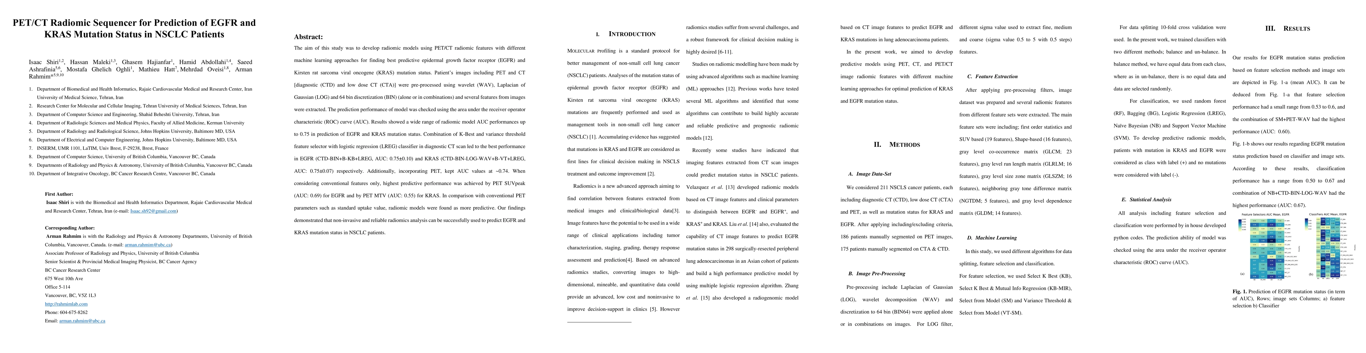 This study developed radiomic models using PET/CT imaging to predict EGFR and KRAS mutations in NSCLC patients, achieving up to 0.75 AUC. The best predictive performance was found using a combination of diagnostic CT features and logistic regression, showing that radiomic models outperform conventional PET parameters.