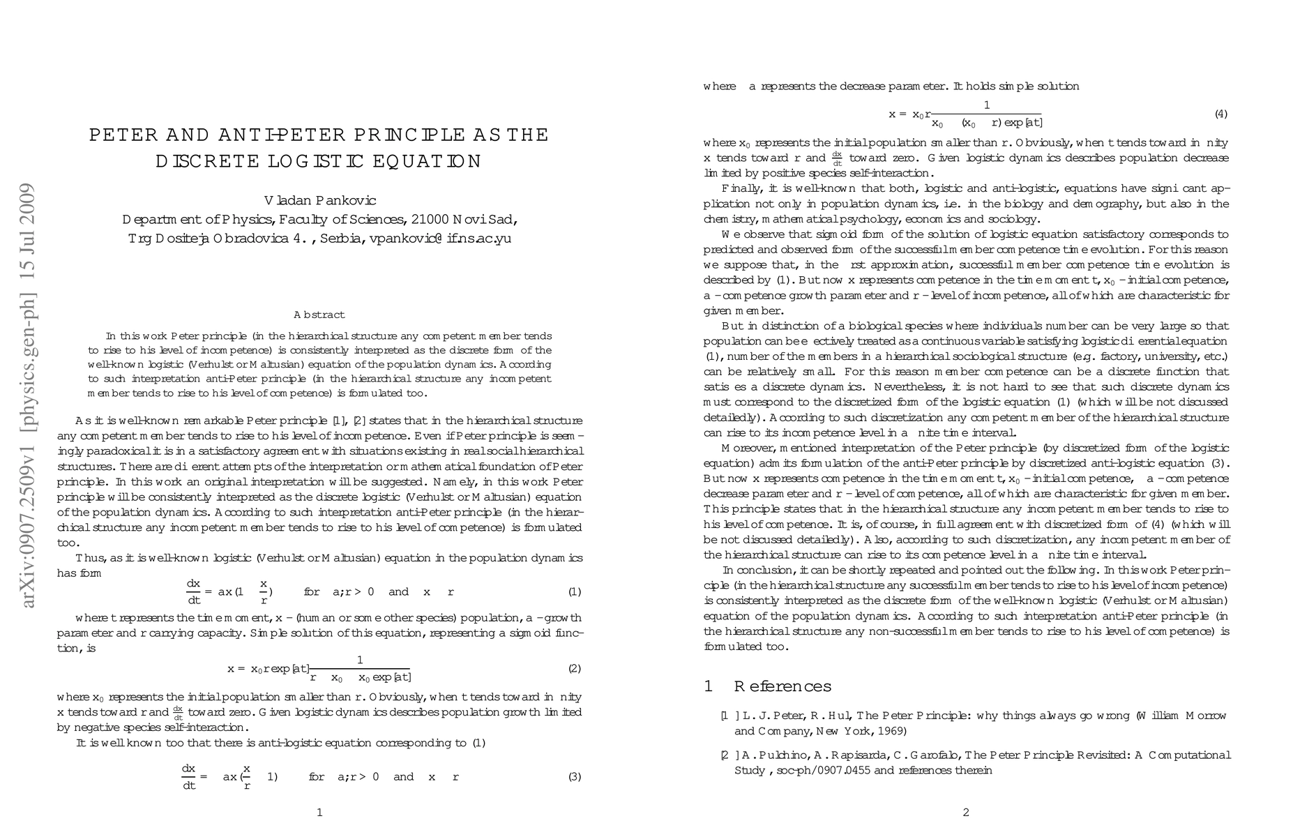 In this work Peter principle (in the hierarchical structure any competent member tends to rise to his level of incompetence) is consistently interpreted as the discrete form of the well-known logistic (Verhulst or Maltusian) equation of the population dynamics. According to such interpretation anti-Peter principle (in the hierarchical structure any incompetent member tends to rise to his level of competence) is formulated too.