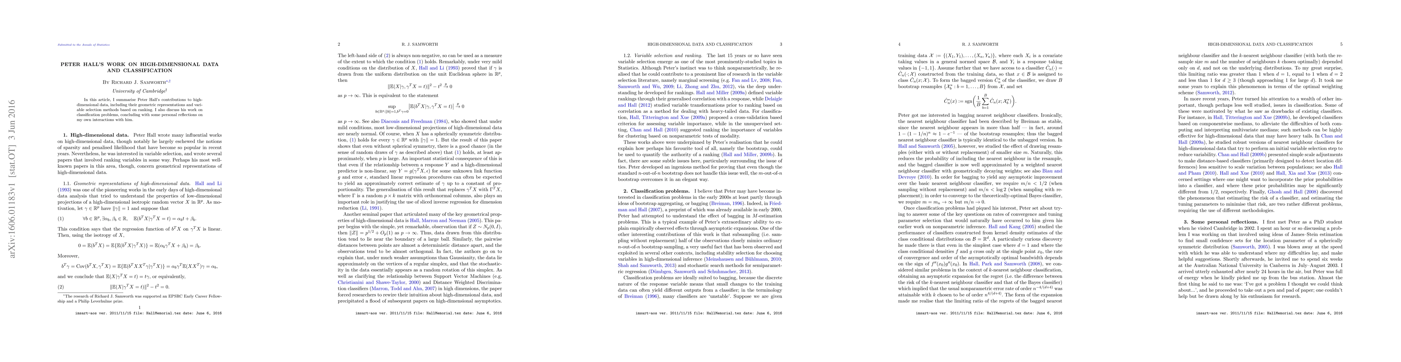 In this article, I summarise Peter Hall's contributions to high-dimensional data, including their geometric representations and variable selection methods based on ranking. I also discuss his work on classification problems, concluding with some personal reflections on my own interactions with him.