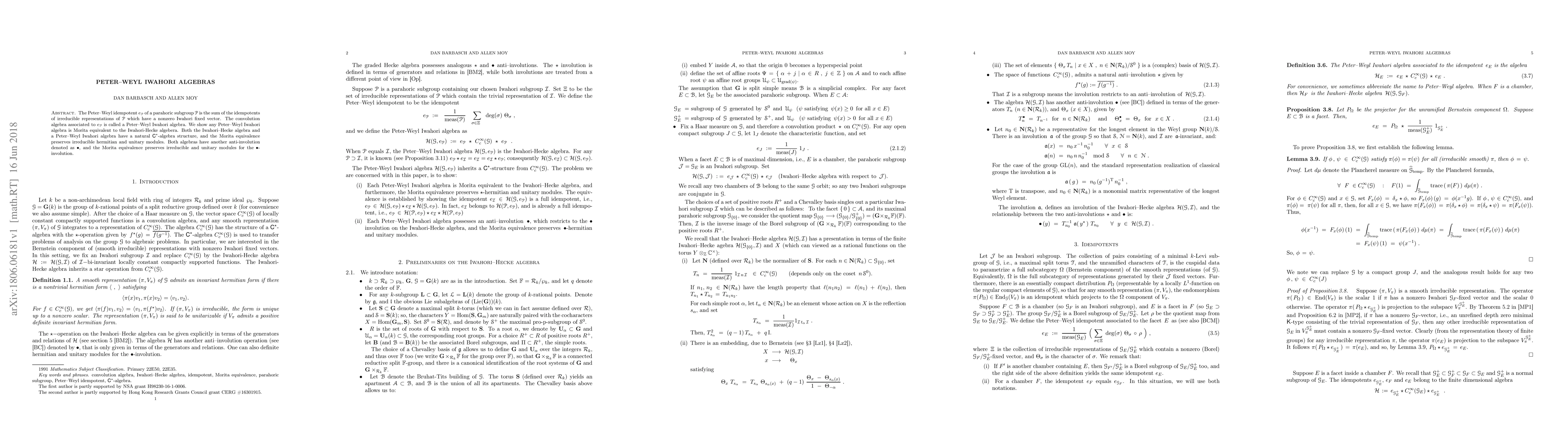 The paper establishes a Morita equivalence between Peter-Weyl Iwahori algebras and Iwahori-Hecke algebras, demonstrating that they share similar module structures under specific anti-involutions.