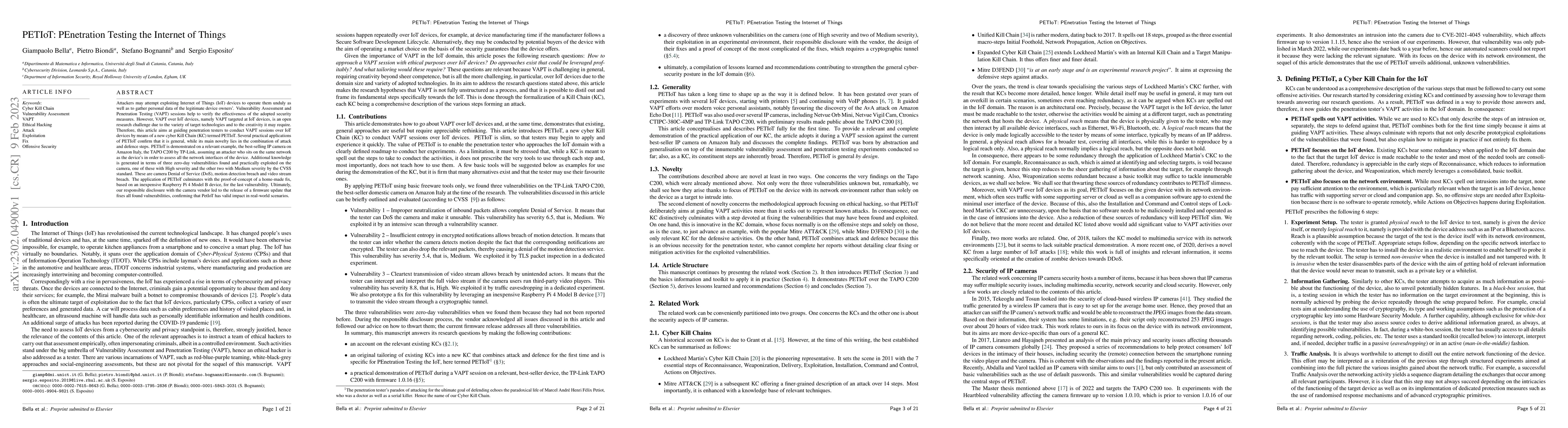 This paper introduces PETIoT, a new cyber Kill Chain for conducting Vulnerability Assessment and Penetration Testing (VAPT) on IoT devices. The method combines attack and defense steps to guide penetration testers, demonstrated through practical applications on a TP-Link IP camera, revealing three zero-day vulnerabilities, and leading to a responsible disclosure that resulted in a firmware update.