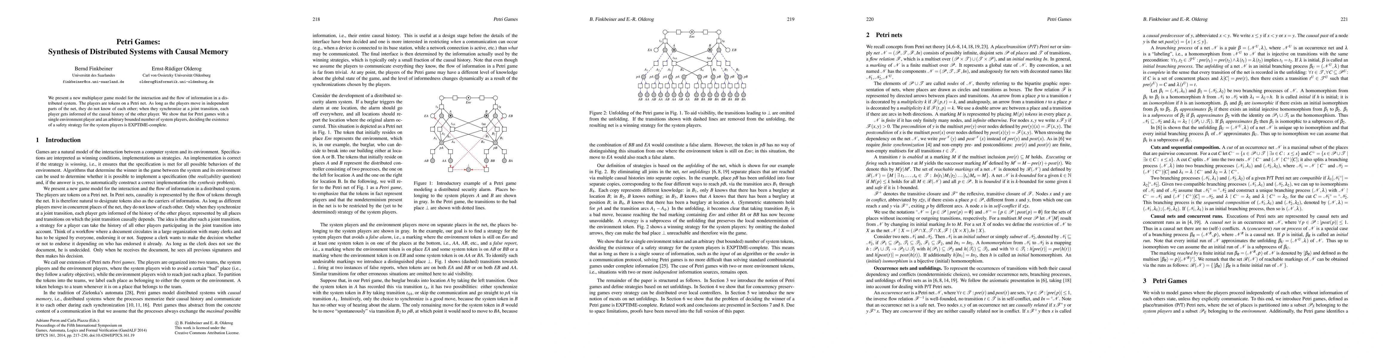 We present a new multiplayer game model for the interaction and the flow of information in a distributed system. The players are tokens on a Petri net. As long as the players move in independent parts of the net, they do not know of each other; when they synchronize at a joint transition, each player gets informed of the causal history of the other player. We show that for Petri games with a single environment player and an arbitrary bounded number of system players, deciding the existence of a safety strategy for the system players is EXPTIME-complete.