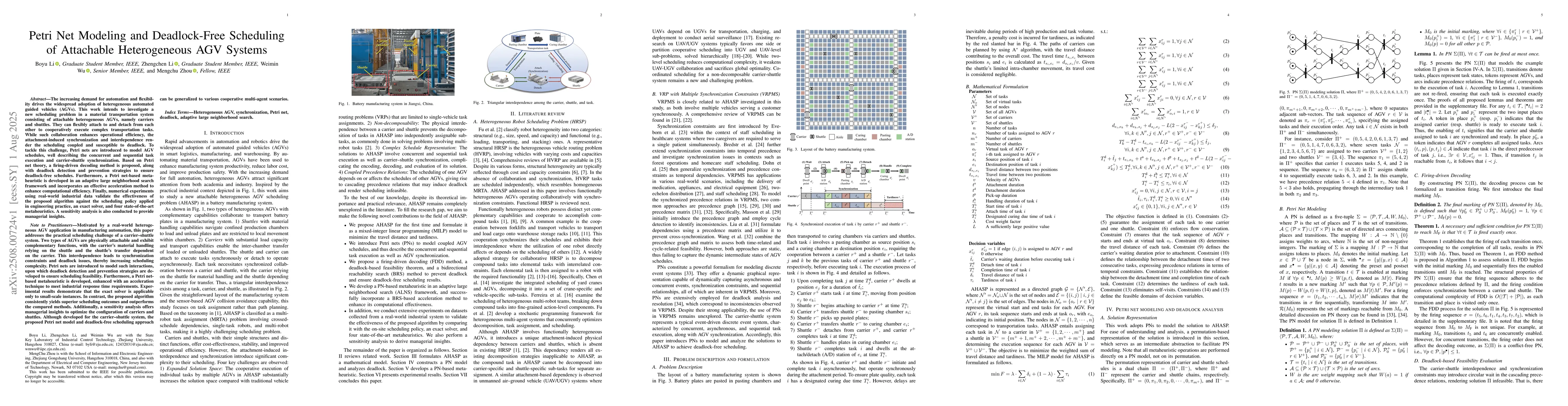 The increasing demand for automation and flexibility drives the widespread adoption of heterogeneous automated guided vehicles (AGVs). This work intends to investigate a new scheduling problem in a material transportation system consisting of attachable heterogeneous AGVs, namely carriers and shuttles. They can flexibly attach to and detach from each other to cooperatively execute complex transportation tasks. While such collaboration enhances operational efficiency, the attachment-induced synchronization and interdependence render the scheduling coupled and susceptible to deadlock. To tackle this challenge, Petri nets are introduced to model AGV schedules, well describing the concurrent and sequential task execution and carrier-shuttle synchronization. Based on Petri net theory, a firing-driven decoding method is proposed, along with deadlock detection and prevention strategies to ensure deadlock-free schedules. Furthermore, a Petri net-based metaheuristic is developed in an adaptive large neighborhood search framework and incorporates an effective acceleration method to enhance computational efficiency. Finally, numerical experiments using real-world industrial data validate the effectiveness of the proposed algorithm against the scheduling policy applied in engineering practice, an exact solver, and four state-of-the-art metaheuristics. A sensitivity analysis is also conducted to provide managerial insights.