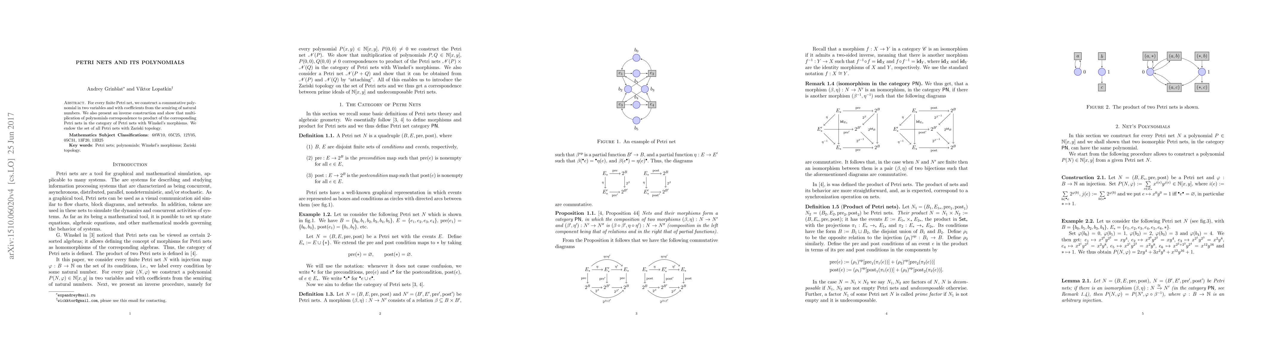 For every finite Petri net, we construct a commutative polynomial in two variables and with coefficients from the semiring of natural numbers. We also present an inverse construction and show that multiplication of polynomials correspondence to the product of the corresponding Petri nets in the category of Petri nets with Winskel's morphisms. We endow the set of all Petri nets with Zariski topology.